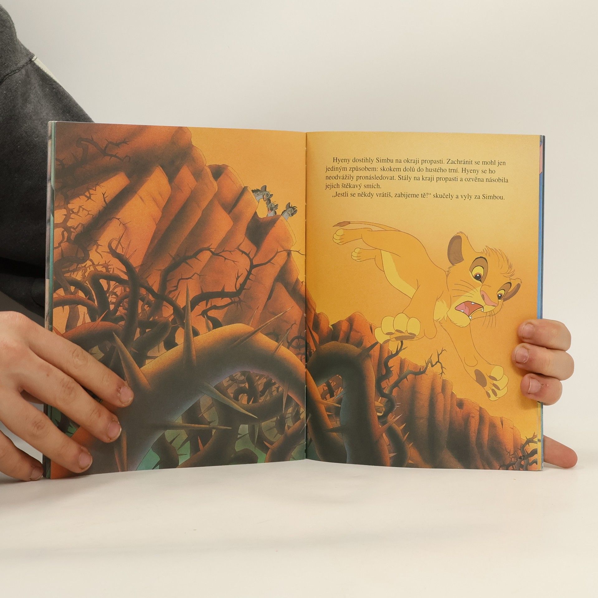 Oranžový kotouč slunce nahlédl prvními žhavými paprsky do nekonečné země písku, skal a stepní trávy a nad tím dílem světa, který lidé pokřtili jménem Afrika, se rozezněly tisíce bubnů a bubínků. Ale to nebouřily bubny! To dusala kopyta zeber a žiraf a dupaly mohutné sloní nohy. A nad bubny vřískaly a pípaly hlasy tisícihlavého sboru dalších zvířat. Všechna spěchala, aby se poprvé poklonila prvorozenému synu lvího krále Mufasy