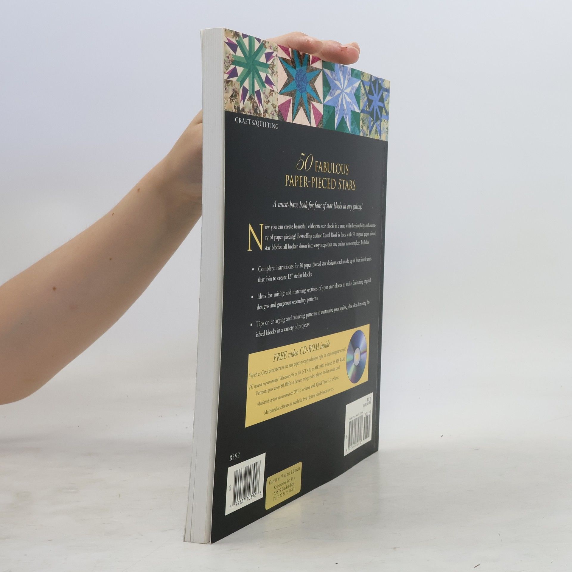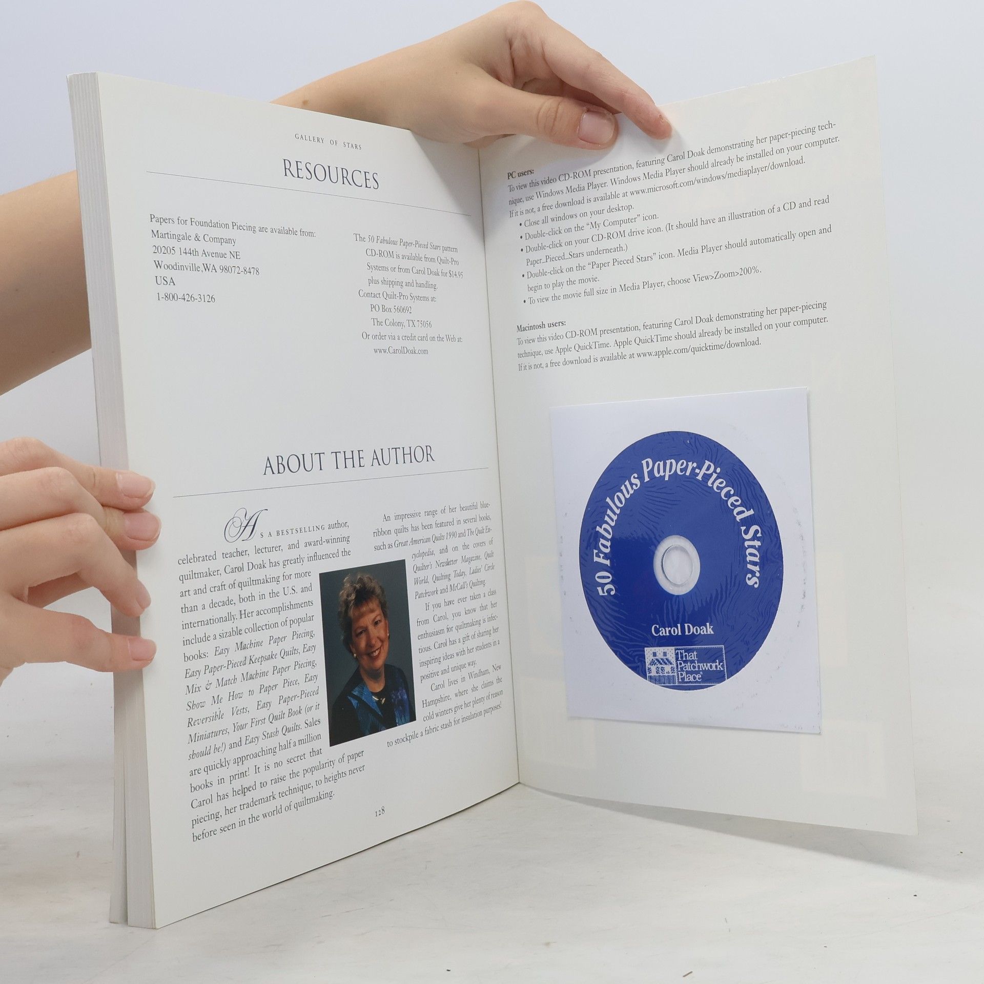 CD-ROM disc consists of 1 movie (.MPG format) (34:46 min.): 50 paper-pieced stars, featuring Carol Doak with Nancy Martin