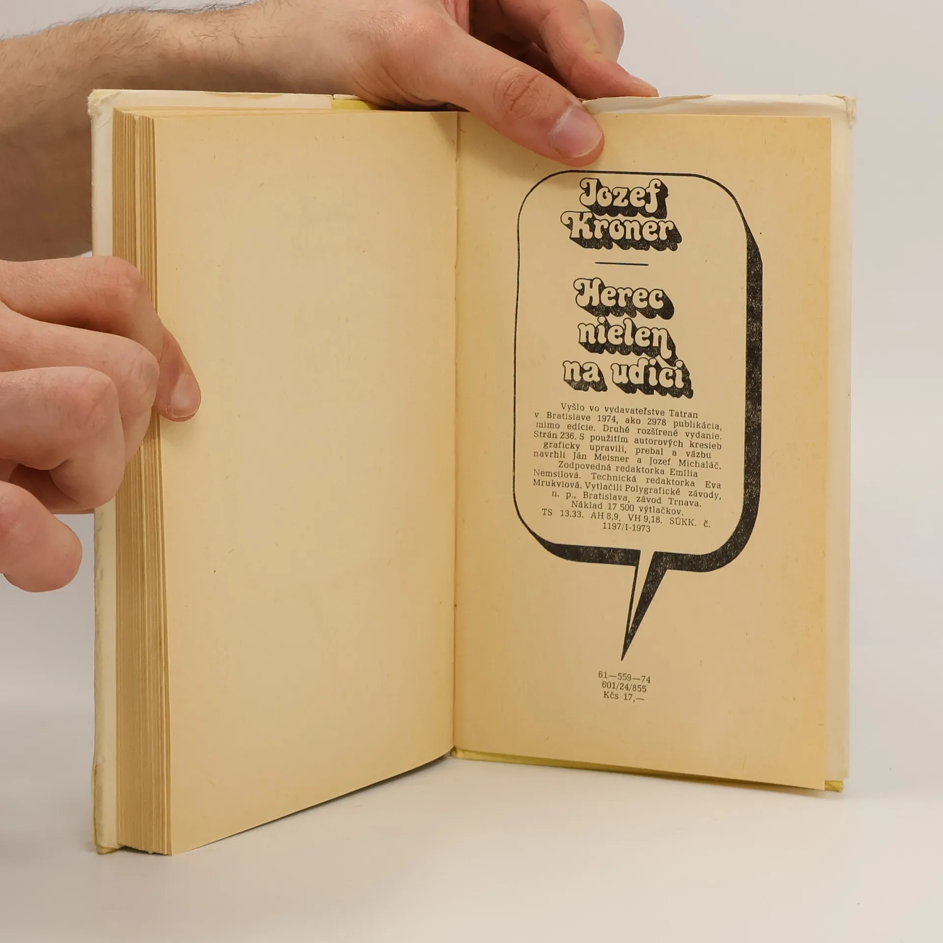 Vynikajúci slovenský herec Jozef Kroner bol aj skvelým spoločníkom s obdivuhodným darom pútavo rozprávať príbehy zo svojho života, ktoré vedel iskrivo precifrovať s dostatočnou mierou dôveryhodnosti. Jeho knižka poviedok, fejtónov, causerií a impresií je predovšetkým knihou úsmevov, dobromyseľnosti a bezprostrednej zábavy. Raz zavedie čitateľov do zákulisia divadle, či k fígľovaniu hercov na scéne, raz do ich súkromných „vylomenín“, inokedy sa zabáva so svojou súkromnou vášňou – rybárčením – a v poslednej časti knihy sa stretávame zväčša s jeho príbuznými a príbehmi, ktoré sa odohrali v rodine Krónerovcov.Skvelá kniha je nielen úžasnou spomienkou na famózneho umelca, ale je aj skutočne vynikajúcim čítaním.Vydanie knihy Jozefa Kronera sprevádzajú majstrove väčšinou ešte nepublikované a nesmierne pôvabné ilustrácie.
