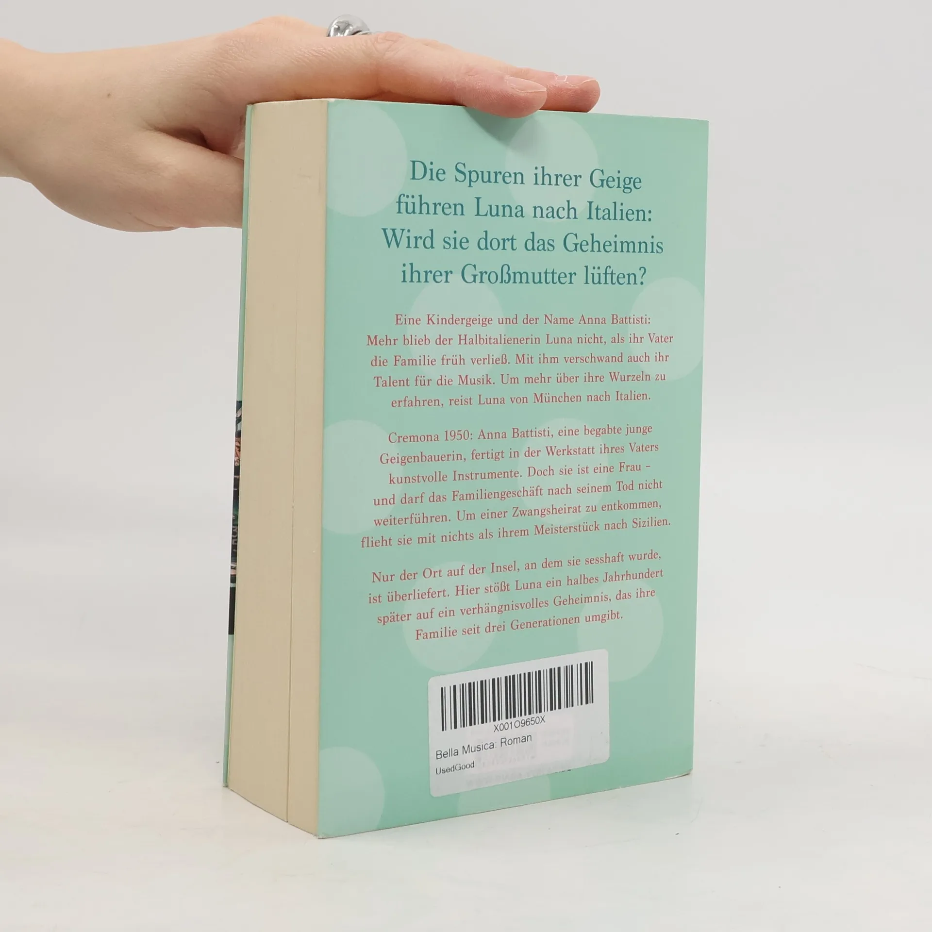Eine Kindergeige und der Name Anna Battisti: Mehr blieb der Halbitalienerin Luna nicht, als ihr Vater die Familie verließ. Mit ihm verschwand auch ihr Talent für die Musik. Auf den Spuren der Geige reist sie von München nach Italien, um mehr über ihre Wurzeln zu erfahren. Cremona 1951: Anna Battisti, eine begabte junge Geigenbauerin, fertigt in der Werkstatt ihres Vaters kunstvolle Instrumente. Doch sie ist eine Frau – und darf das Familiengeschäft nach seinem Tod nicht weiterführen. Um einer Zwangsheirat zu entkommen, flieht sie mit nichts als ihrem Meisterstück nach Sizilien. Nur der Ort auf der Insel, an dem sie sesshaft wurde, ist überliefert. Hier findet Luna heraus, wer ihre Großmutter war und lüftet das tragische Geheimnis, das ihre Familie seit drei Generationen umgibt.