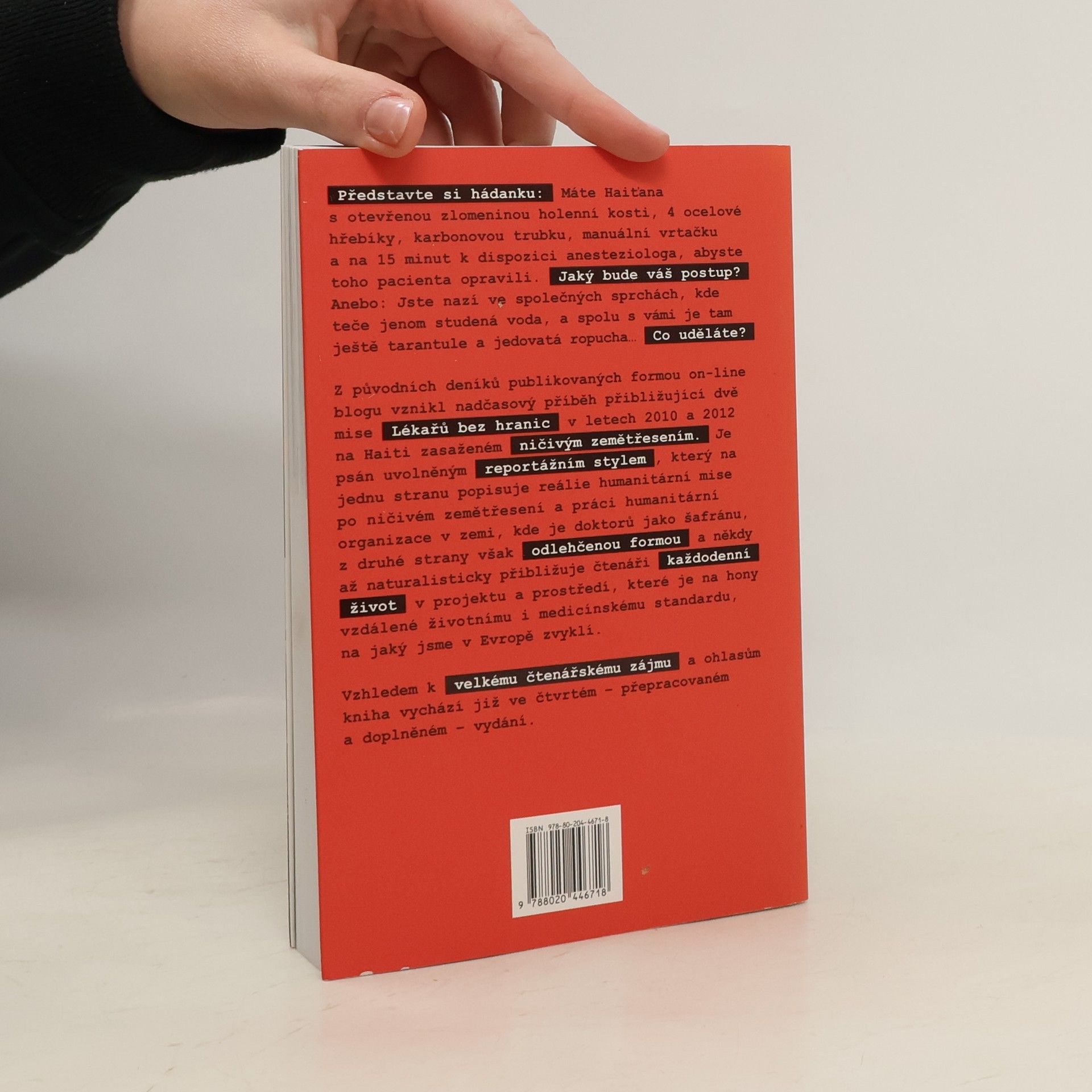 Pět měsíců českého chirurga s Lékaři bez hranic. V lednu 2010 zasáhlo Haiti ničivé zemětřesení, které připravilo o život statisíce lidí a postihlo celkově miliony obyvatel této nádherné karibské země. Mezinárodní humanitární organizace Lékaři bez hranic zasahovala na místě již od prvních hodin a během pěti měsíců po katastrofě ošetřila téměř 200 tisíc pacientů a provedla více než 11 tisíc operací. Při vší úctě k této organizaci a vážnosti situace není tento příběh výčtem suchých a většinou tragických faktů. Není ani oficiálním stanoviskem Lékařů bez hranic. Je to osobní příběh českého chirurga, který se k Lékařům bez hranic připojil a prožil s nimi své první měsíce spolupráce na Haiti v roce 2010 a 2012. Formou původně blogových příspěvků, které vznikaly bezprostředně každý den přímo na misi, reportážním způsobem s prvky černého humoru, naturalismu, nadsázky a také určité míry vulgarity autor popisuje svá pracovní i volnočasová pozorování. Vzhledem k velkému zájmu nyní kniha vychází ve čtvrtém a přepracovaném vydání.