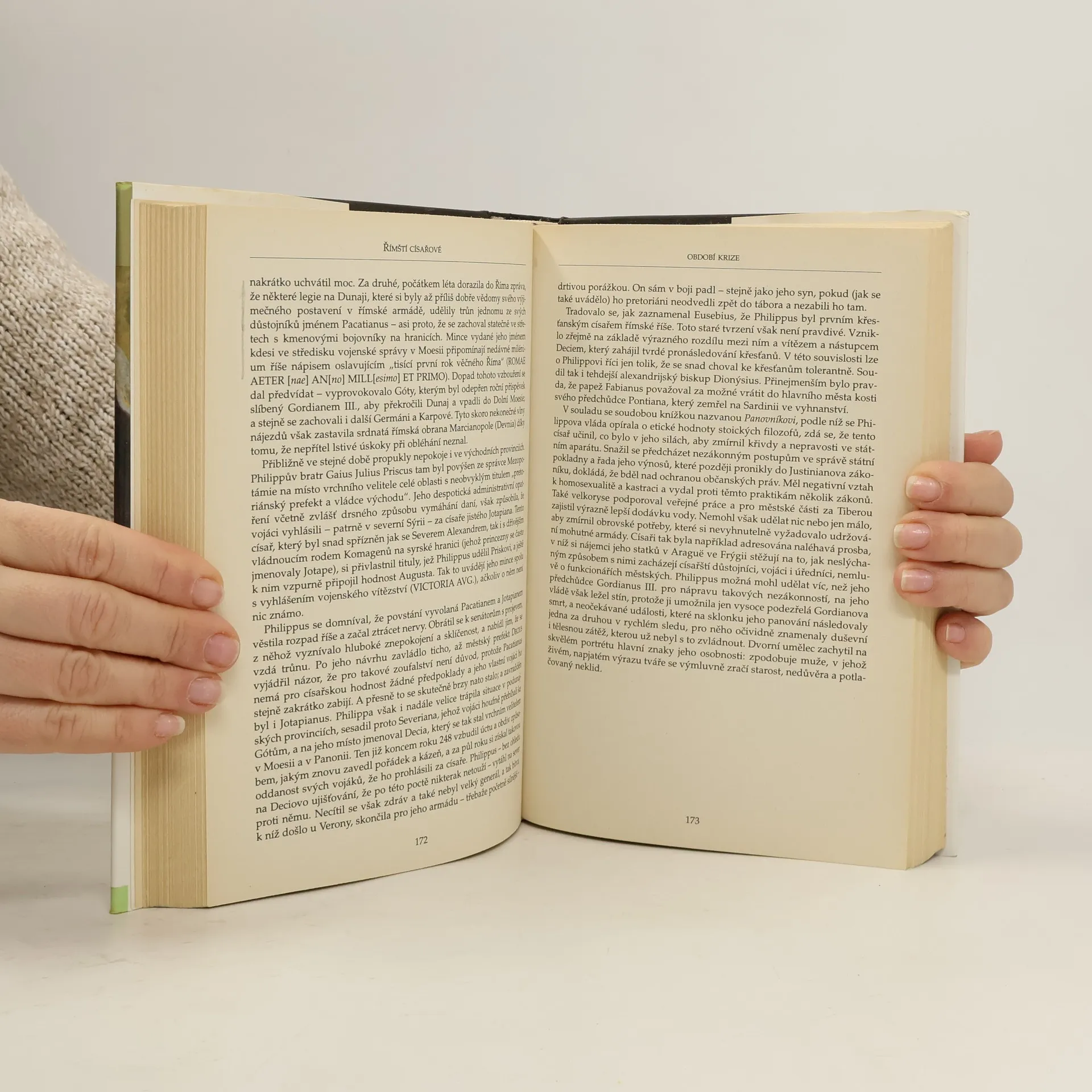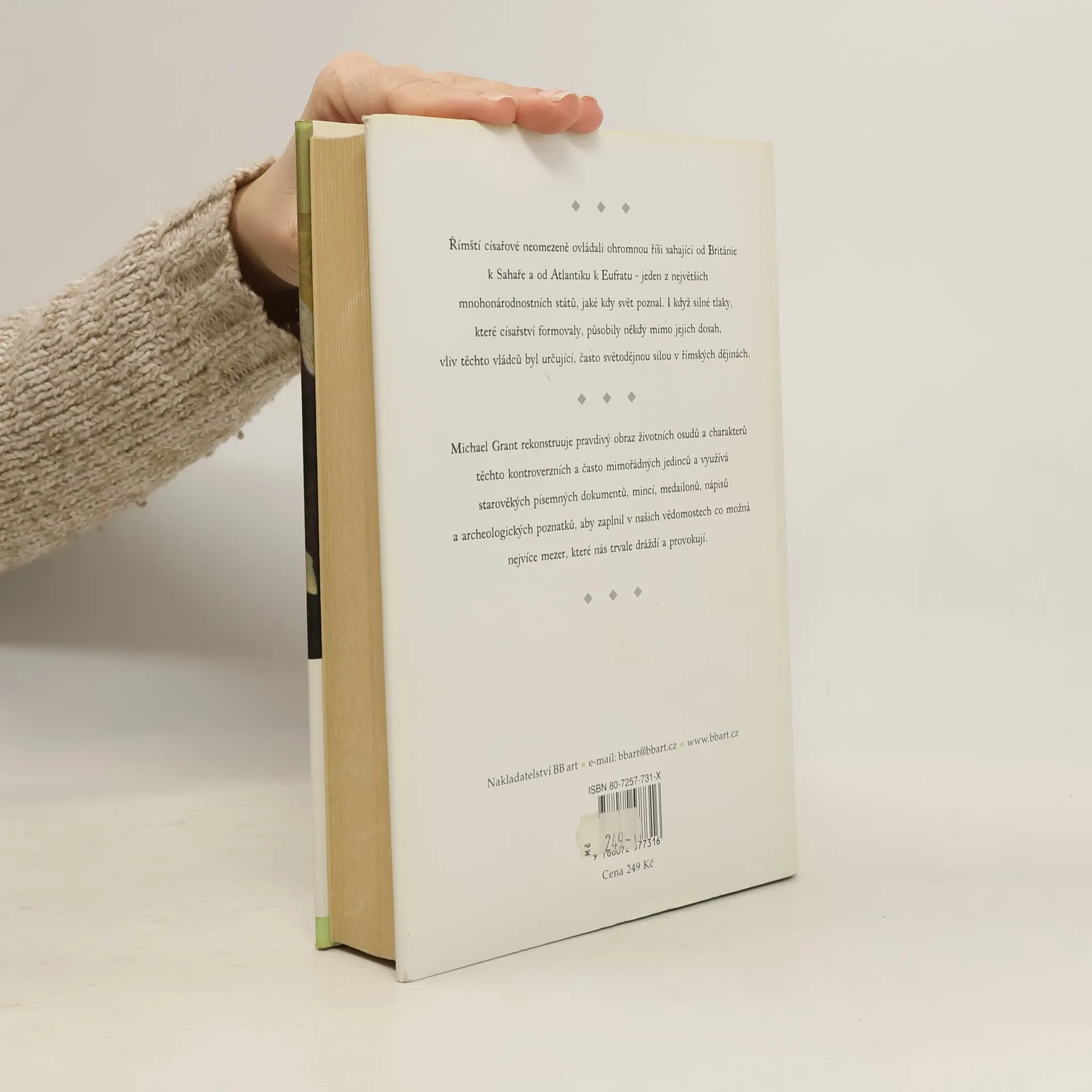 Období císařství – poslední fáze existence římské říše – zahrnuje zhruba pět set let (31 př. Kr. až 476), během nichž se na trůně vystřídalo kolem dvou set vládců. Michael Grant z nich pro svou práci vybral devadesát dva osobností, které významným způsobem ovlivnily vývoj státu prostírajícího se na území tří kontinentů a zanechaly v mnoha ohledech hluboké a trvalé stopy na naší civilizaci. Na základě široké znalosti dobových pramenů – jejichž spolehlivost a objektivnost pečlivě zvažuje – odhaluje autor větší či menší schopnosti těchto vládců spravovat tak obrovský stát a řešit jeho problémy. Osudy jednotlivých panovníků zachycuje tak nejen na pozadí téměř nepřetržitých válečných tažení a krvavých osobních střetů v boji o moc mezi uchazeči o trůn. Zabývá se i významnými politickými, právními a měnovými reformami některých císařů a zdůrazňuje jejich zájmy umělecké (např. Traianus, Hadrianus, Diocletianus, Constantinus) zejména o zkrášlení sídelních měst, díky nimž lze obdivovat architektonická díla, která přetrvala dodnes. Michael Grant věnuje pozornost i povahovým rysům jednotlivých panovníků, jejich talentům, slabostem, výstřednostem a samozřejmě i vnějšímu vzhledu, a čerpá jak z písemných záznamů, tak i z portrétů na mincích a bystách, které knihu doprovázejí.