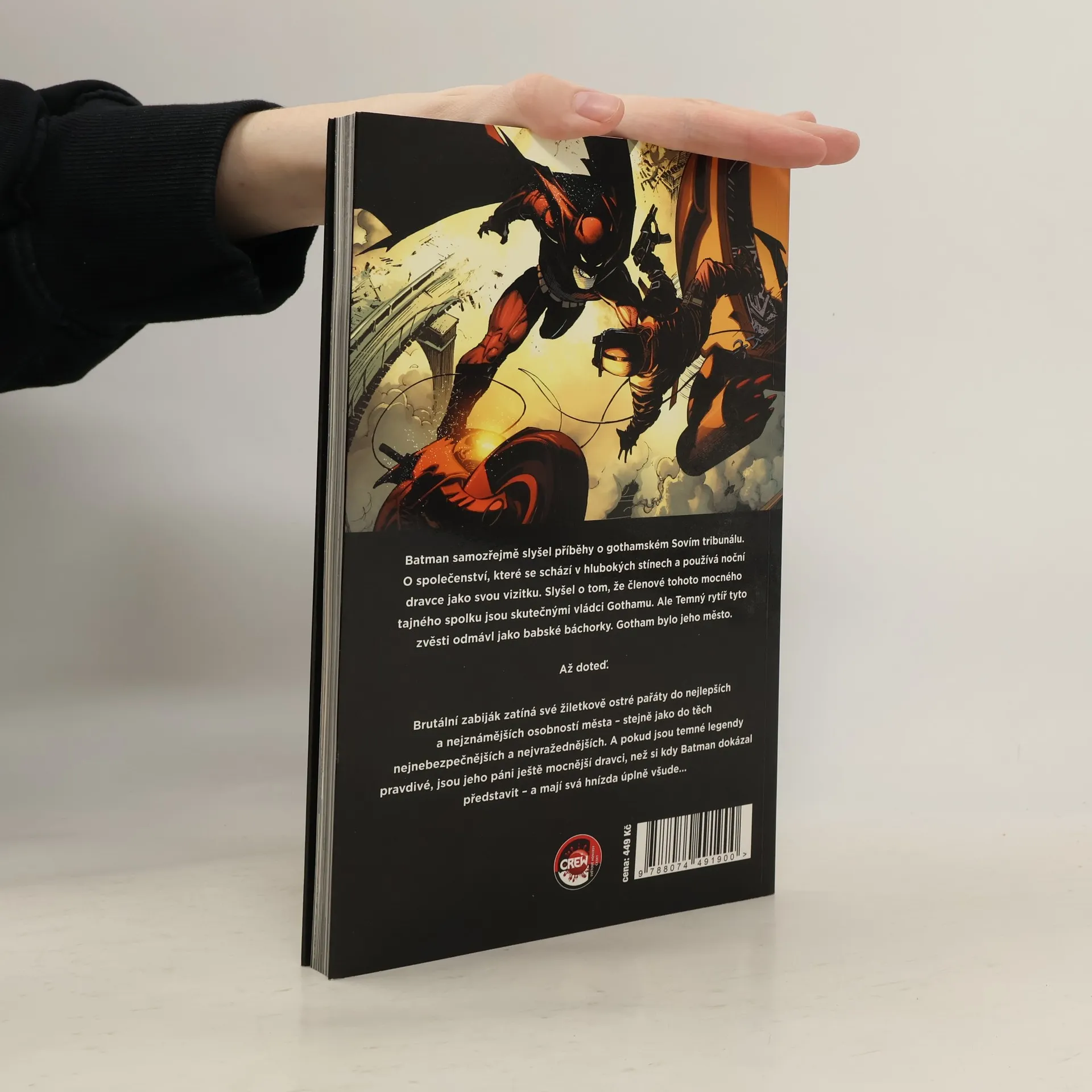 Batman samozřejmě slyšel příběhy o gothamském Sovím tribunálu. O společenství, které se schází v hlubokých stínech a používá noční dravce jako svou vizitku. Slyšel o tom, že členové tohoto mocného tajného spolku jsou skutečnými vládci Gothamu. Ale Temný rytíř tyto zvěsti odmávl jako babské báchorky. Gotham bylo jeho město. Až doteď. Brutální zabiják zatíná své žiletkově ostré pařáty do nejlepších a nejznámějších osobností města – stejně jako do těch nejnebezpečnějších a nejvražednějších. A pokud jsou temné legendy pravdivé, jsou páni města ještě mocnější dravci, než si kdy Batman dokázal představit – a mají svá hnízda úplně všude... Hvězdný tým složený ze scenáristy Scotta Snydera a Grega Capulla hrdě uvádí závratnou ságu tajemství a děsu!