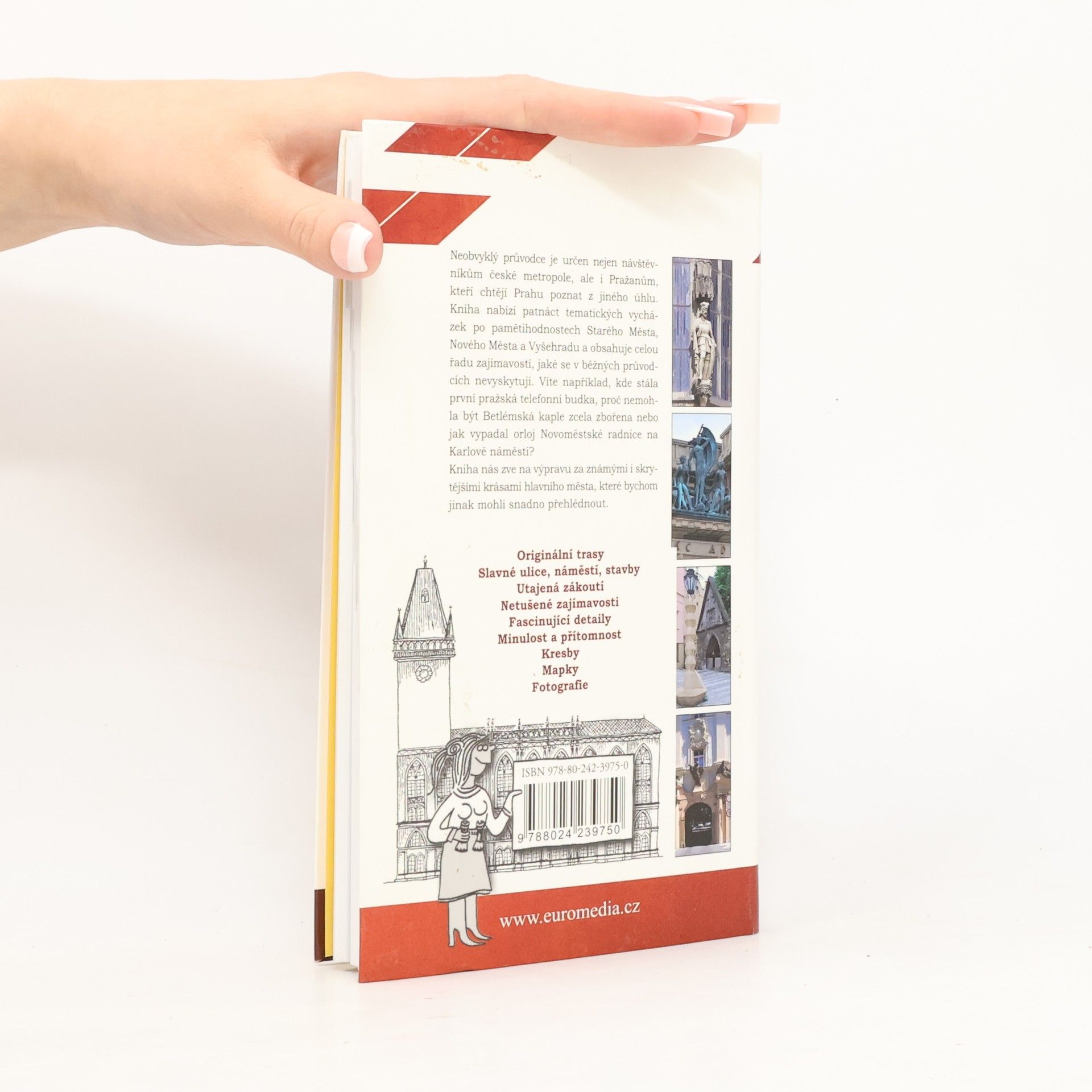 Historicko-místopisný průvodce po Praze, určený nejen Pražanům, ale i návštěvníkům české metropole, kteří chtějí Prahu poznat z jiného úhlu. Nabízí 15 tematických vycházek po pamětihodnostech Starého města, Nového města a Vyšehradu, se řadou zajímavostí a zvláštností, které se v průvodcích mnohdy nevyskytují. Součástí knihy jsou mapky se všemi objekty, o nichž je v textu řeč, černobílé kresby zobrazující to, co už k vidění není, a unikátní fotografie zachycující domy či různé zdobné prvky, které nejsou běžně přístupné nebo které ke své škodě při dnešním životním tempu snadno přehlédneme.