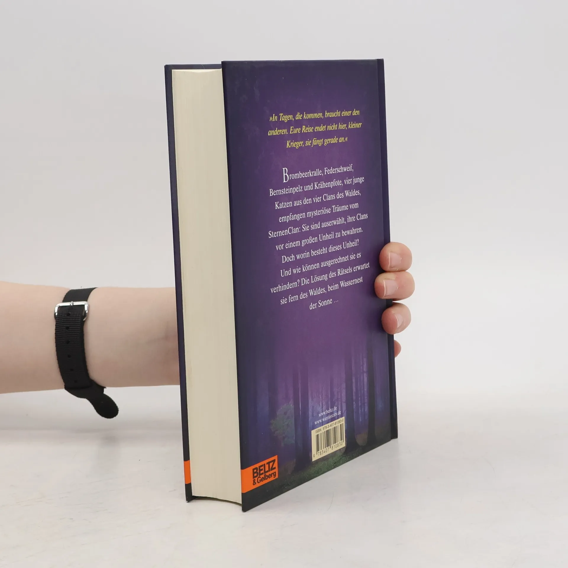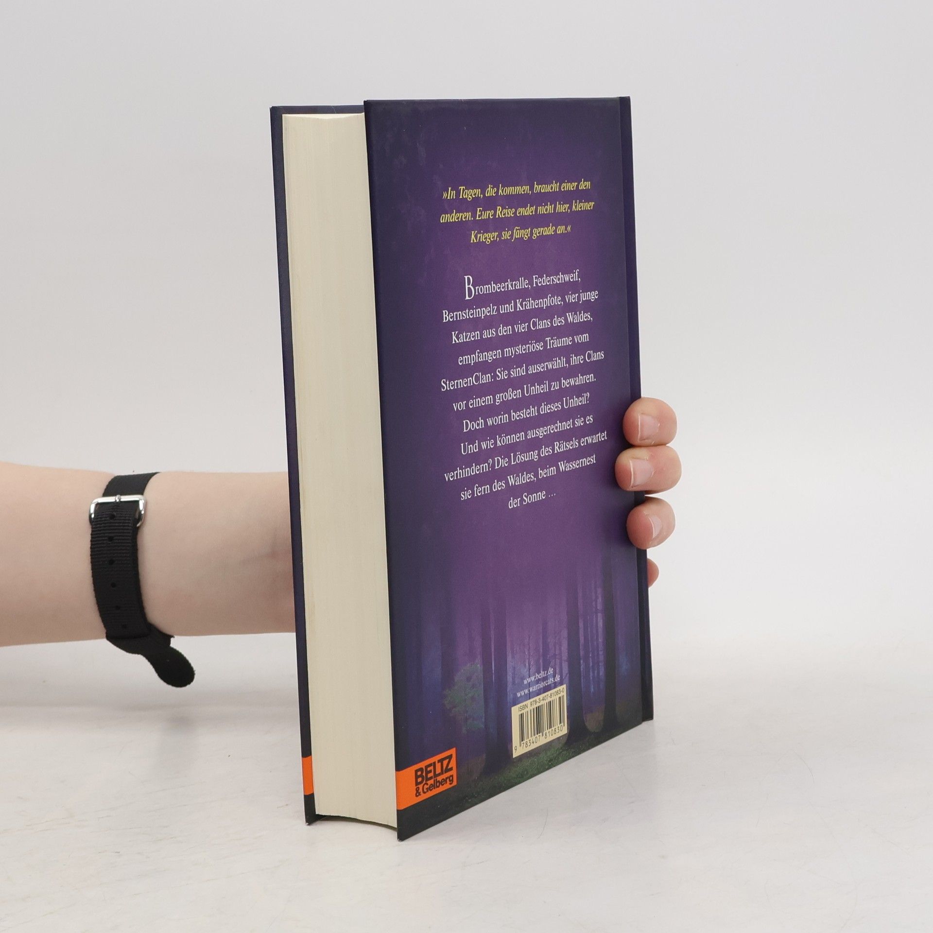 Die neue Prophezeiung: »Finsternis, Luft, Wasser und Himmel werden zusammentreffen... und den Wald bis in seine Wurzeln erschüttern.« »In Tagen, die kommen, braucht einer den anderen. Eure Reise endet nicht hier, kleiner Krieger, sie fängt gerade an.« Brombeerkralle, Federschweif, Bernsteinpelz und Krähenpfote, vier junge Katzen aus den vier Clans des Waldes empfangen mysteriöse Träume vom SternenClan: Sie sind auserwählt, ihre Clans vor einem großen Unheil zu bewahren. Doch worin besteht dieses Unheil? Und wie können ausgerechnet sie es verhindern? Die Lösung des Rätsels erwartet sie fern des Waldes, beim Wassernest der Sonne...