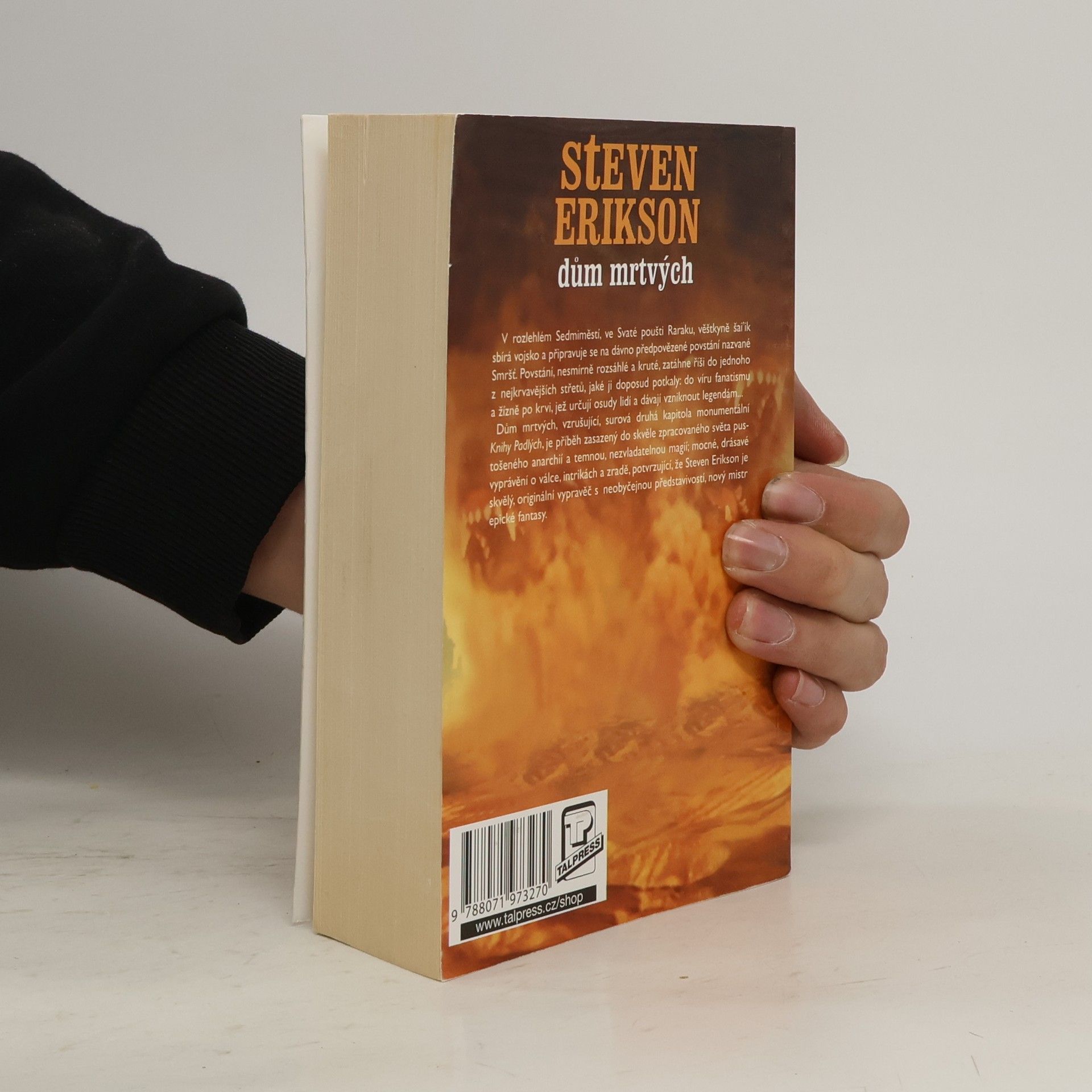 Malazská říše, oslabená událostmi v Darúdžhistánu, balancuje na pokraji chaosu. V rozlehlém Sedmiměstí, ve Svaté poušti Raraku, věštkyně šai'ik sbírá vojsko a připravuje se na dávno předpovězené povstání nazvané Smršť. Povstání, nesmírně rozsáhlé a kruté, zatáhne říši do jednoho z nejkrvavějších střetů, jaké ji doposud potkaly: do víru fanatismu a žízně po krvi, jež určují osudy lidí a dávají vzniknout legendám… Dům mrtvých, vzrušující, surová druhá kapitola monumentální malazské Knihy Padlých, je příběh zasazený do skvěle zpracovaného světa pustošeného anarchií a temnou, nezvladatelnou magií; mocné, drásavé vyprávění o válce, intrikách a zradě, potvrzující, že Steven Erikson je skvělý, originální vypravěč s neobyčejnou představivostí, nový mistr epické fantasy.