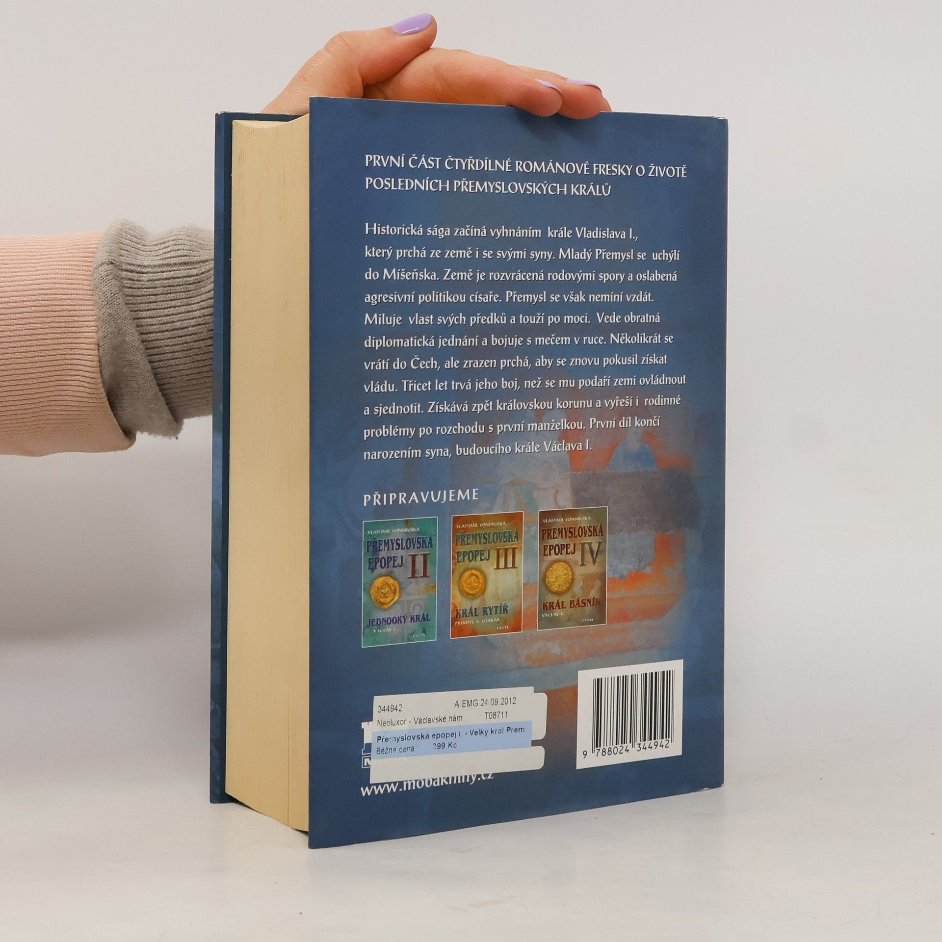 Velký král Přemysl Otakar I. První část čtyřdílné románové fresky o životě posledních přemyslovských králů. Historická sága začíná v českém knížectví, rozvráceném rodovými spory, v němž se vlády ujímá mladý Přemysl Otakar I. Postupně upevňuje moc, získává zahraniční spojence a za pomoc císaři získává královskou korunu. Dostane se do sporu s církví, je dán pražským biskupem do klatby, ale dosáhne smíru s církví a vojensky vpadne do rakouských zemí. Jeho politické úspěchy otevírají cestu českému království mezi evropské velmoci 13. století.
