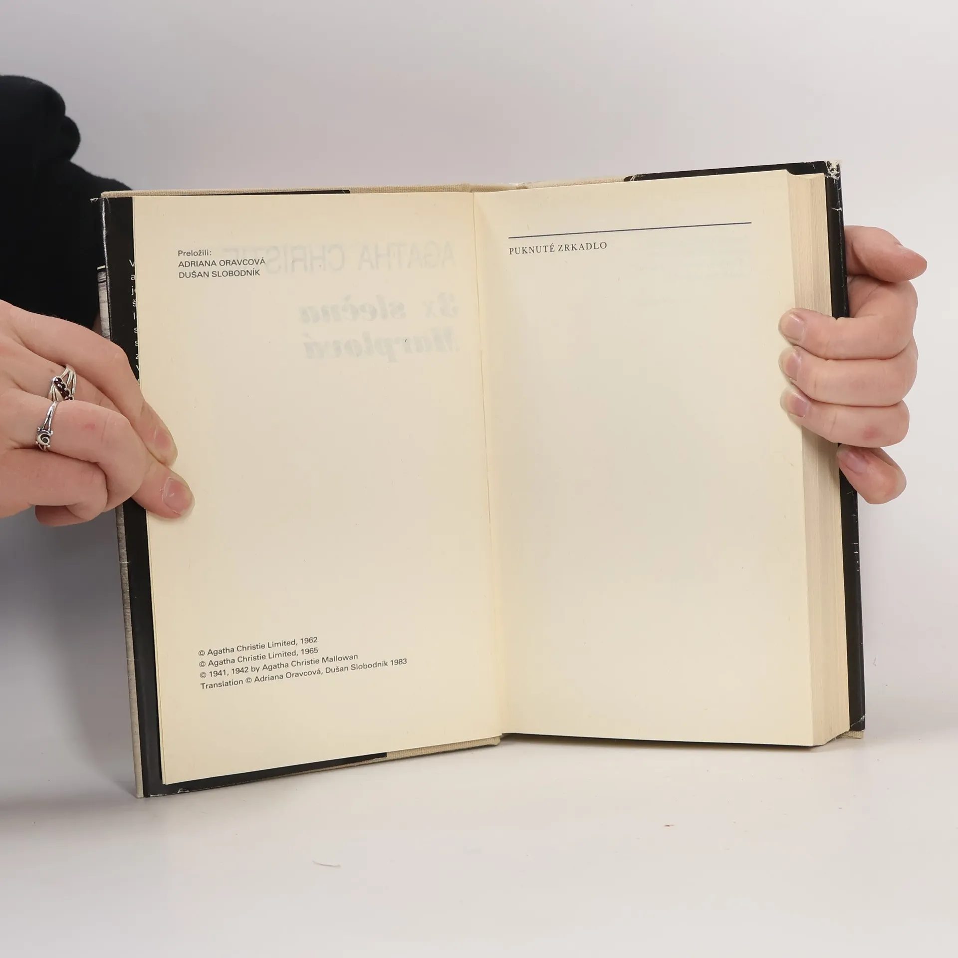Výber z diela najplodnejšej anglickej autorky detektívneho žánru predstavuje obľúbenú postavu – navonok neškodnú, milú a sympatickú Jane Marplovú, ktorá pomocou prenikavého postrehu a skvelých kombinačných schopností rieši záhadné zločiny na základe znalosti ľudskej duše. V prvom príbehu „Puknuté zrkadlo“ nás autorka uvádza do malebnej anglickej dedinky St. Mary Meadu, rodiska slečny Marplovej. Pokojnú hladinu vidieckeho života rozvíri príchod slávnej herečky, za ktorým nasledujú napínavé udalosti, vrcholiace vraždami. Druhý príbeh „V hoteli Bertram“ sa odohráva v luxusnom londýnskom hoteli, poskytujúcom služby v „starom štýle“. Jane Marplová ako jedna z návštevníčok sa stáva svedkom vraždy súvisiacej s veľkou vlakovou lúpežou. Tretí príbeh „Mŕtva v knižnici“ čerpá opäť z vidieckeho prostredia a zo života vyšších spoločenských vrstiev. Kto zavraždil mladú tanečnicu, ktorej telo nájdu v knižnici seriózneho starého plukovníka? Toto odhalenie opäť ostáva na milej slečne, ktorej nikdy nechýba anglický zmysel pre humor.