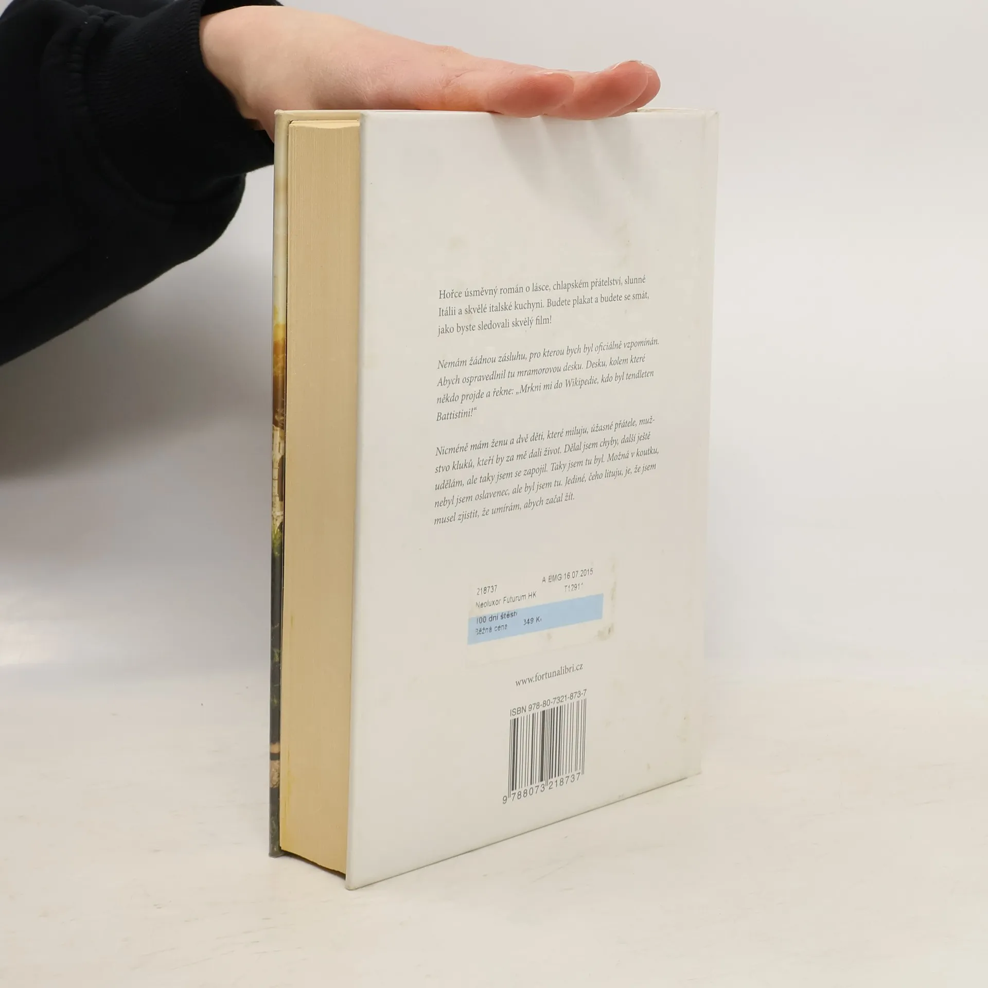Hořce úsměvný román o lásce, chlapském přátelství, slunné Itálii a skvělé italské kuchyni. Budete plakat a budete se smát, jako byste sledovali skvělý film! Nemám žádnou zásluhu, pro kterou bych byl oficiálně vzpomínán. Abych ospravedlnil tu mramorovou desku. Desku, kolem které někdo projde a řekne: „Mrkni mi do Wikipedie, kdo byl tendleten Battistini!“ Nicméně mám ženu a dvě děti, které miluju, úžasné přátele, mužstvo kluků, kteří by za mě dali život. Dělal jsem chyby, další ještě udělám, ale taky jsem se zapojil. Taky jsem tu byl. Možná v koutku, nebyl jsem oslavenec, ale byl jsem tu. Jediné, čeho lituju, je, že jsem musel zjistit, že umírám, abych začal žít.
