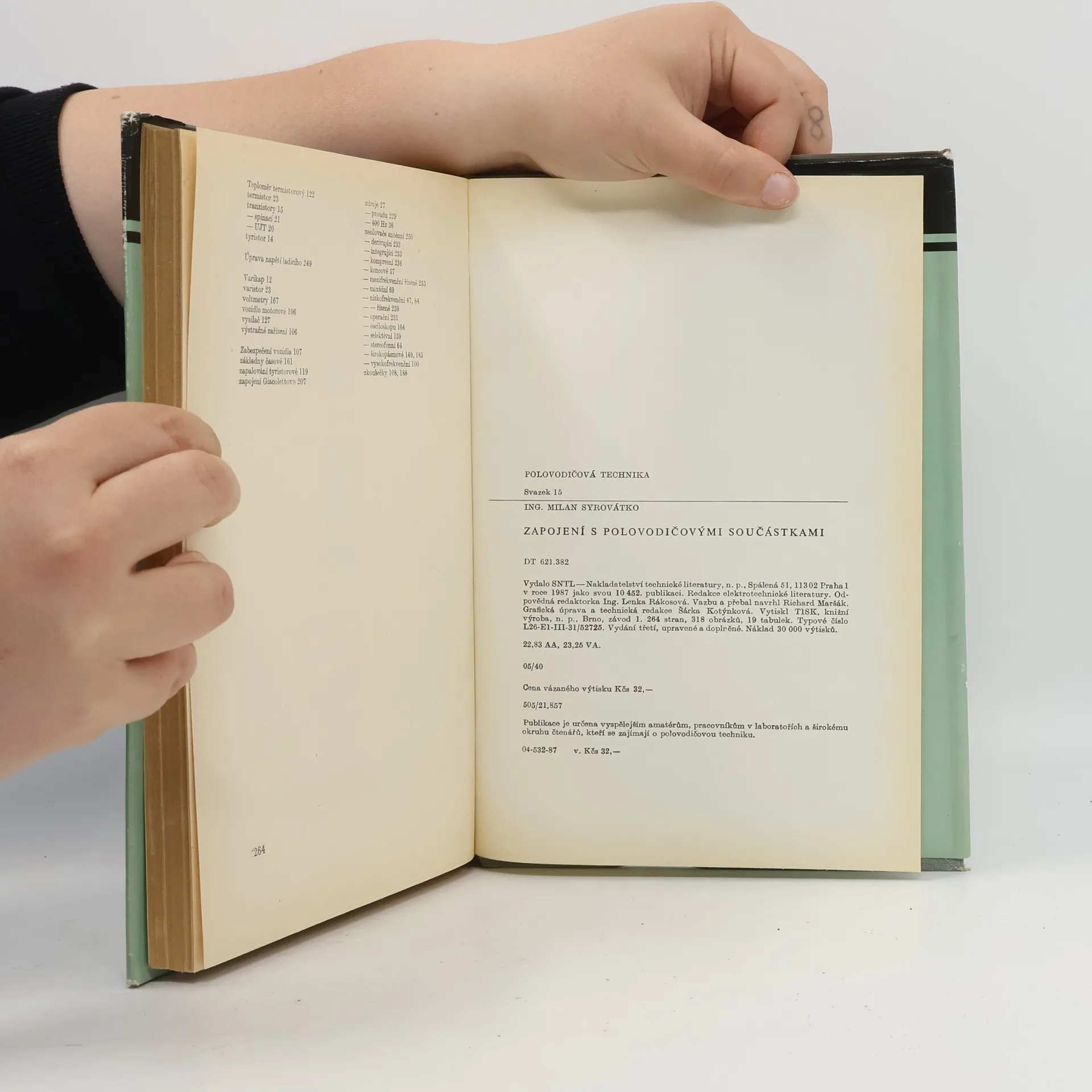 Základní vlastnosti a pojmy polovodičové techniky, Napájecí obvody, Nízkofrekvenční zesilovače, Přijímače a jejich části, Polovodičová technika v motorových vozidlech, Aplikace polovodičů v oborech mimo elektrotechniku, Různá zařízení, Laboratorní pomůcky a měřící přístroje, Meření polovodičů a měřiče, Přehled a tabulkové hodnoty polovodičových součástek, Napájecí obvody a nízkofrekvenční technika, Vysokofrekvenční obvody a pomocná zařízení. 291 obrázků, 17 tabulek. 04-527-80