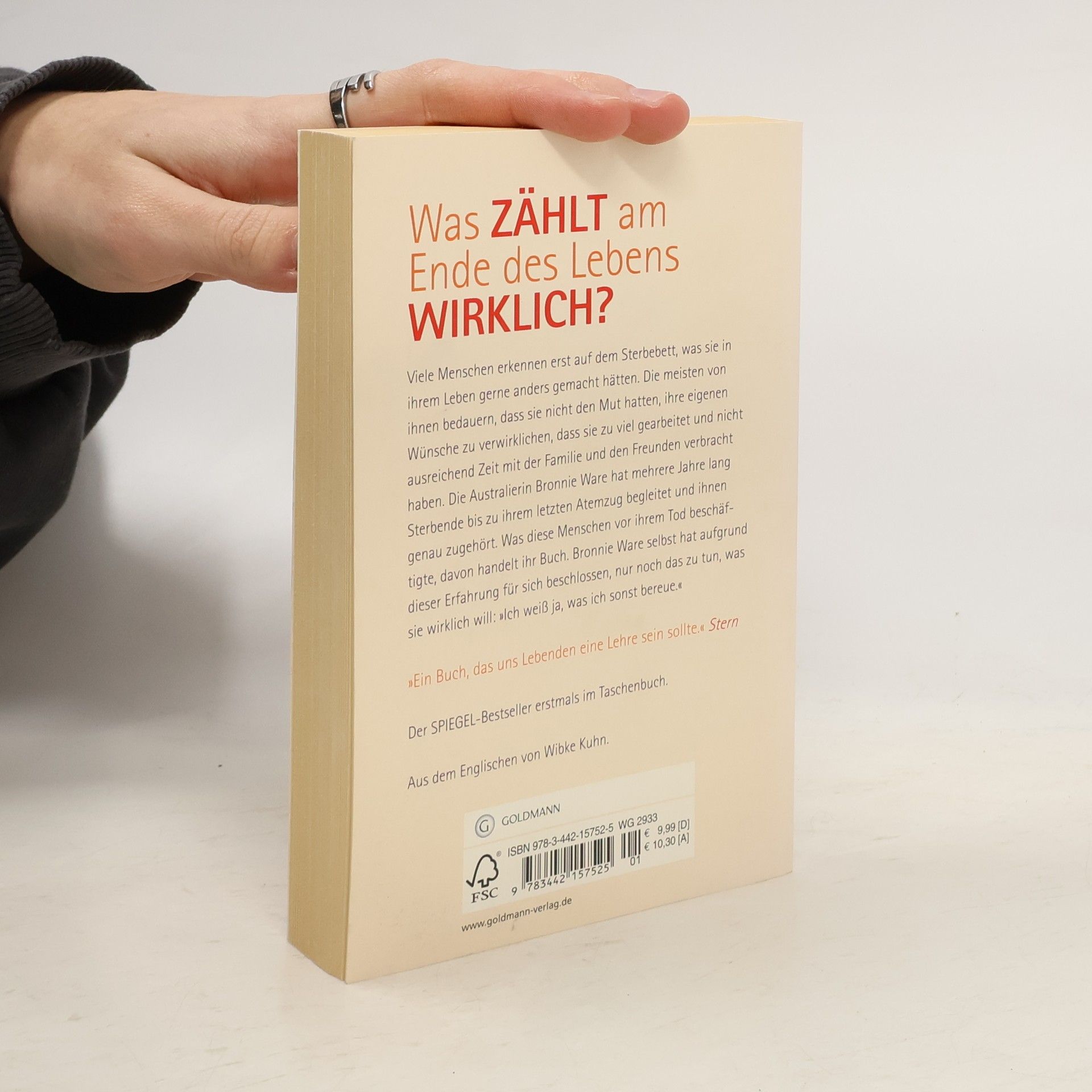 Was zählt am Ende des Lebens wirklich? Wenn man mit dem Tod konfrontiert ist, geht es nicht mehr um Geld. Um Macht. Um Ruhm. Sondern um ganz fundamentale Fragen: Hat man ausreichend Zeit mit der Familie und den Freunden verbracht? Bereut man es, Dinge getan oder, noch wichtiger, unterlassen zu haben? War man glücklich? Die Australierin Bronnie Ware hat mehrere Jahre lang Sterbende bis zu ihrem letzten Atemzug begleitet und ihnen genau zugehört. Was diese Menschen vor ihrem Tod beschäftigte, davon handelt ihr Buch. Ware selbst hat aufgrund dieser Erfahrung beschlossen, nur noch das zu tun, was sie wirklich will. Denn, so sagt sie, „ich weiß ja, was ich sonst bereue.“