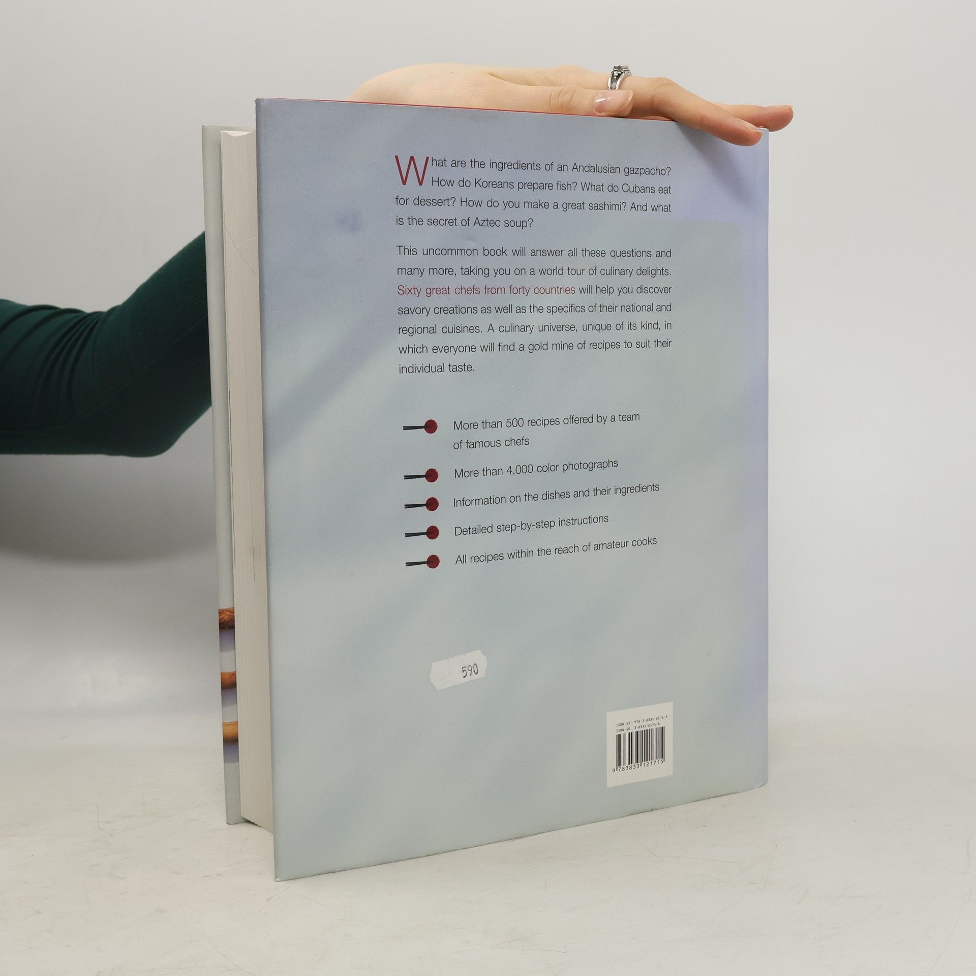 If you're looking for the entire world of cookery -this is the book that has it. On more than 1,000 pages, 60 renowned chefs from 40 countries present their favorite recipes. Page for page, true gourmets will be delighted to discover the wide spectrum of soups and appetizers, fish and meat dishes, sweets and desserts presented in words and pictures, along with practical hints on ingredients, methods and cooking times