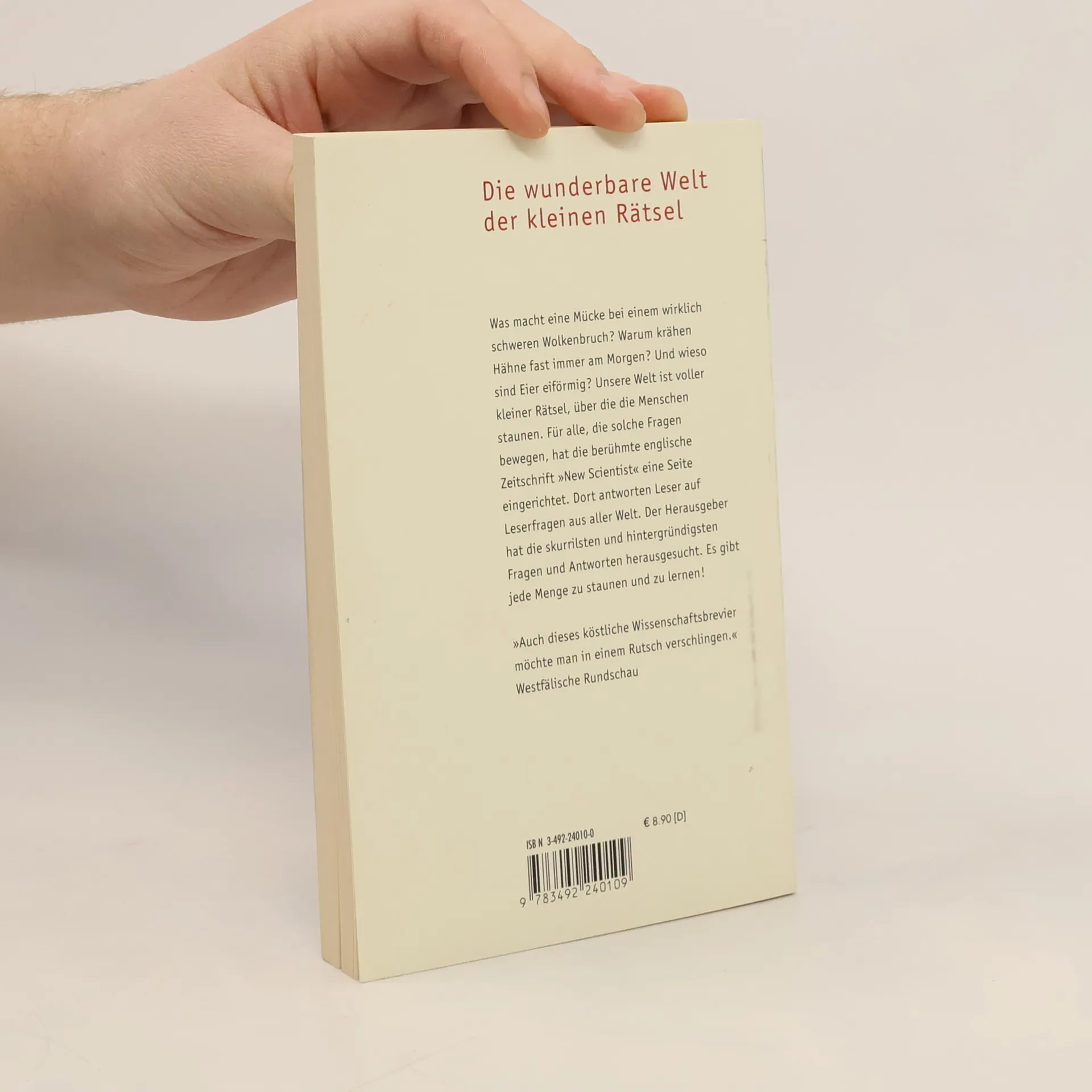 Was macht eine Mücke bei einem wirklich schweren Wolkenbruch? Warum krähen Hähne fast immer am Morgen? Und wieso sind Eier eiförmig? Unsere Welt ist voller kleiner Rätsel, über die die Menschen staunen. Für alle, die solche Fragen bewegen, hat die berühmte englische Zeitschrift "The Scientist" eine Seite eingerichtet. Dort antworten Leser auf Leserfragen aus aller Welt. Der Herausgeber hat die skurrilsten und hintergründigsten Fragen und Antworten herausgesucht. Es gibt jede Menge zu staunen und zu lernen!