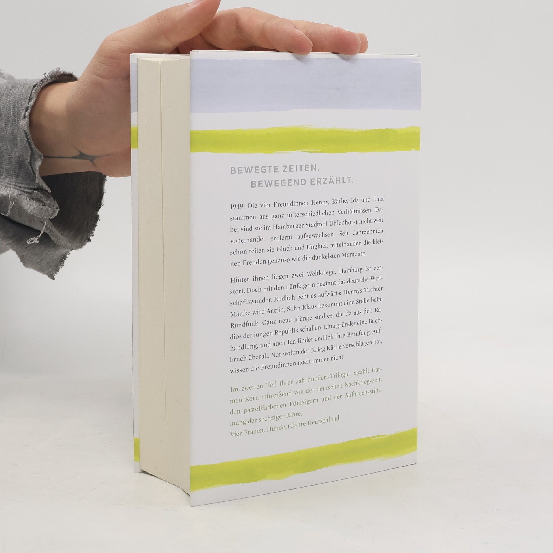 Wirtschaftswunder, Rock ‘n‘ Roll, Cocktailpartys – der zweite Teil der Jahrhundert-Trilogie1949: Die vier Freundinnen Henny, Käthe, Ida und Lina stammen aus ganz unterschiedlichen Verhältnissen. Dabei sind sie im Hamburger Stadtteil Uhlenhorst nicht weit voneinander entfernt aufgewachsen. Seit Jahrzehnten schon teilen sie Glück und Unglück miteinander, die kleinen Freuden genauso wie die dunkelsten Momente. Hinter ihnen liegen zwei Weltkriege. Hamburg ist zerstört. Doch mit den Fünfzigern beginnt das deutsche Wirtschaftswunder. Endlich geht es aufwärts: Hennys Tochter Marike wird Ärztin, Sohn Klaus bekommt eine Stelle beim Rundfunk. Ganz neue Klänge sind es, die da aus den Radios der jungen Republik schallen. Lina gründet eine Buchhandlung, und auch Ida findet endlich ihre Berufung. Aufbruch überall. Nur wohin der Krieg Käthe verschlagen hat, wissen die Freundinnen noch immer nicht.Im zweiten Teil ihrer Jahrhundert-Trilogie erzählt Carmen Korn mitreißend von der deutschen Nachkriegszeit, den pastellfarbenen Fünfzigern und der Aufbruchsstimmung der Sechzigerjahre. Vier Frauen. Hundert Jahre Deutschland.
