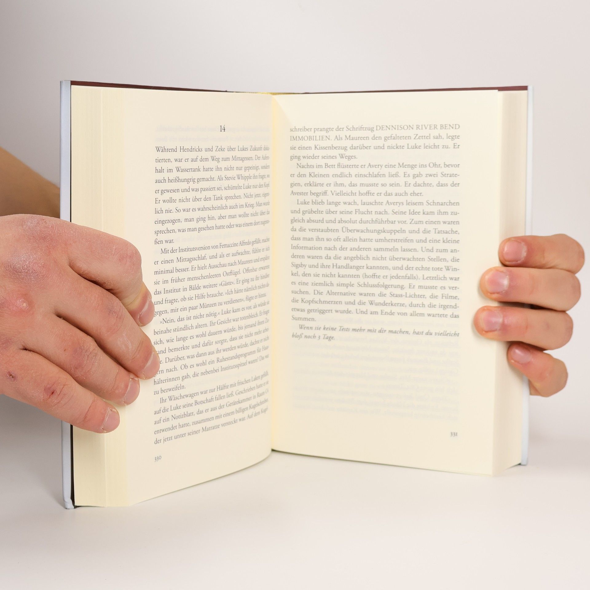 In einer ruhigen Vorortsiedlung von Minneapolis ermorden zwielichtige Eindringlinge lautlos die Eltern von Luke Ellis und verfrachten den betäubten Zwölfjährigen in einen schwarzen SUV. Die ganze Operation dauert keine zwei Minuten. Luke wacht weit entfernt im Institut wieder auf, in einem Zimmer, das wie seines aussieht, nur dass es keine Fenster hat. Und das Institut in Maine beherbergt weitere Kinder, die wie Luke paranormal veranlagt sind: Kalisha, Nick, George, Iris und den zehnjährigen Avery. Sie befinden sich im Vorderbau des Instituts. Luke erfährt, dass andere vor ihnen nach einer Testreihe im »Hinterbau« verschwanden. Und nie zurückkehrten. Je mehr von Lukes neuen Freunden ausquartiert werden, desto verzweifelter wird sein Gedanke an Flucht, damit er Hilfe holen kann. Noch nie zuvor ist jemand aus dem streng abgeschirmten Institut entkommen.