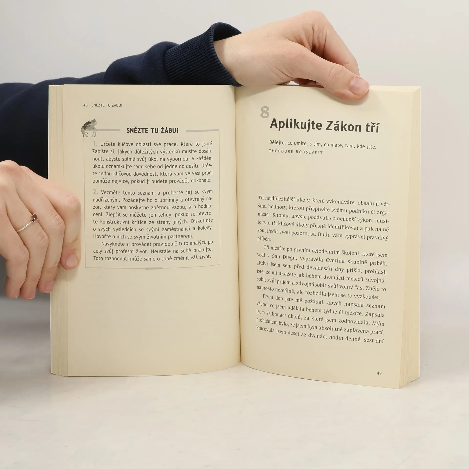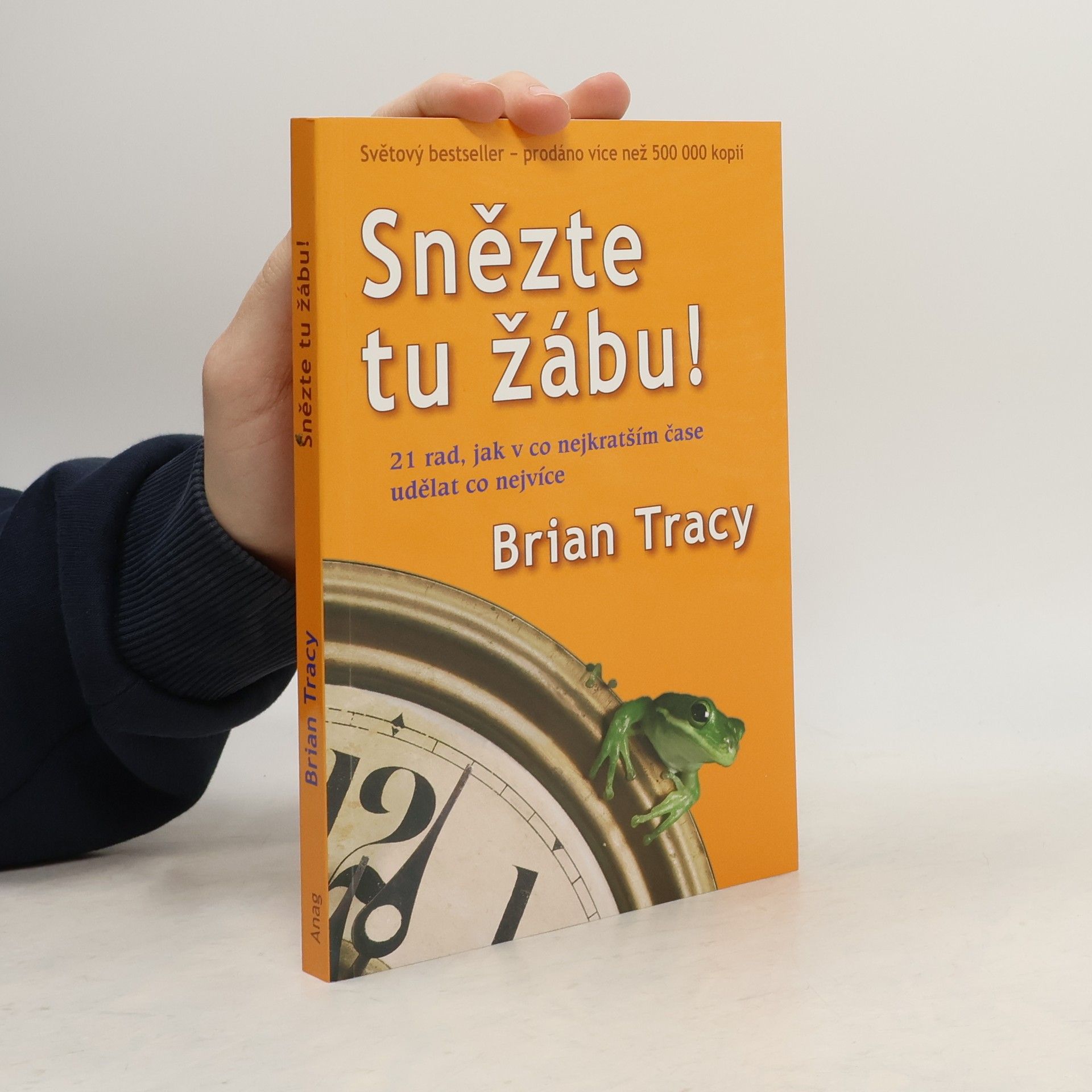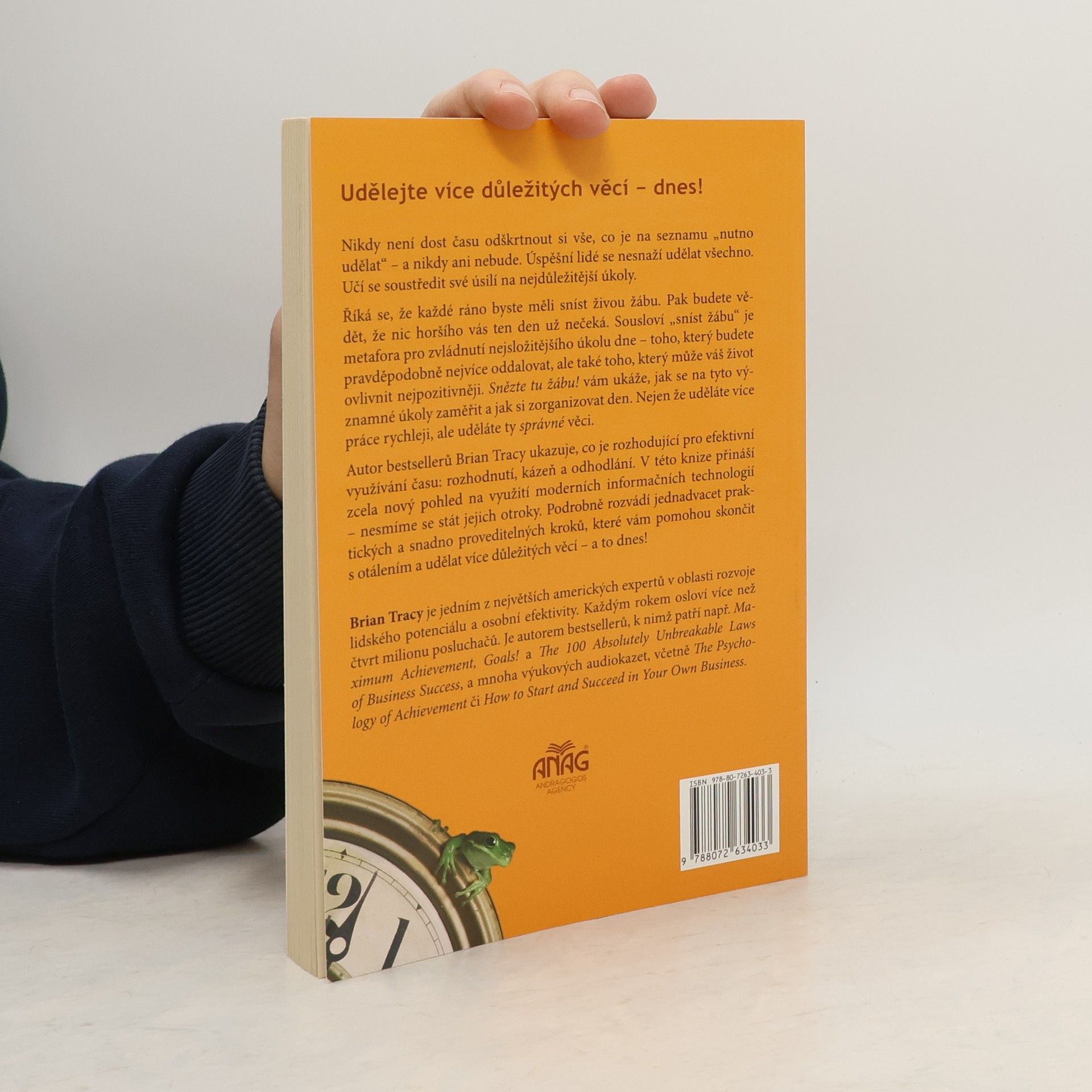 Tato knižní novinka je klíčem k velkému úspěchu, získání si respektu, dobrého postavení a ke šťastnému životu. Přináší zcela nový pohled na efektivní využití času pomocí 21 jednoduchých, ale zaručených metod, které používají úspěšní lidé po celém světě. Kniha vám ukáže cestu, jak skončit s otálením a udělat více důležitých věcí právě dnes. Změňte způsob svého myšlení a dosáhněte tak svých vytoužených cílů. Užíváním metafory "snězte tu žábu" učí Brian Tracy své čtenáře, jak se zbavit těch nejnáročnějších úkolů a zorganizovat si svůj čas. Neznamená to však splnit více povinností, ale dělat jen ty správné věci. Pouze ty mohou, podle jednoho z největších amerických expertů v oblasti rozvoje lidského potenciálu a osobní efektivity, přinést více úspěchu, peněz, ale také volného času a tím změnit Váš život k lepšímu - jednou provždy! Knihy Snězte tu žábu! se po světě prodalo více než 500 000 výtisků a tím se zařadila mezi světové bestsellery. Nakladatelství Anag ji nyní vydalo i pro ČR.