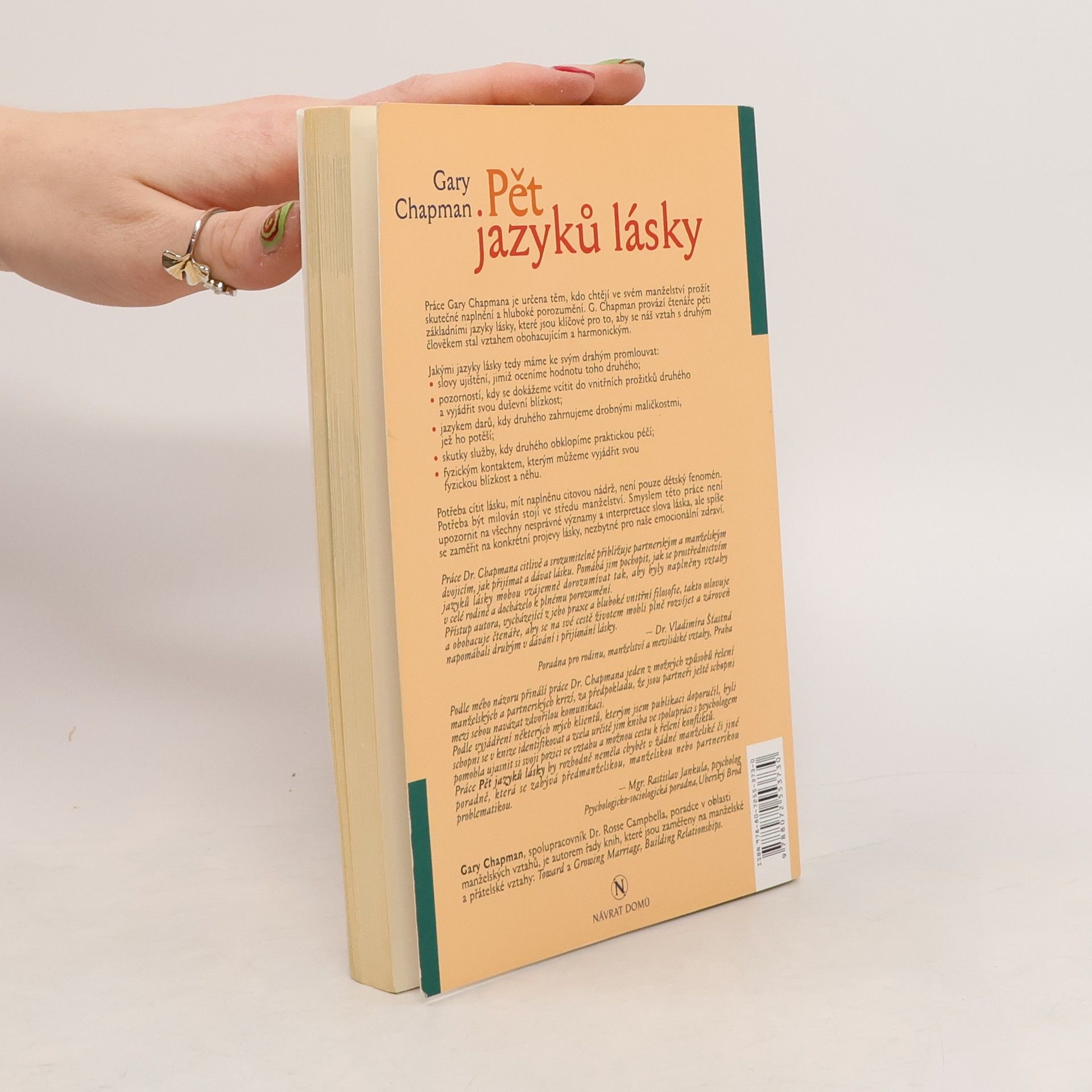 Práce Gary Chapmana je určena těm, kdo chtějí ve svém manželství prožít skutečné naplnění a hluboké porozumění. G. Chapman provází čtenáře pěti základními jazyky lásky, které jsou klíčové pro to, aby se náš vztah s druhým člověkem stal vztahem obohacujícím a harmonickým.