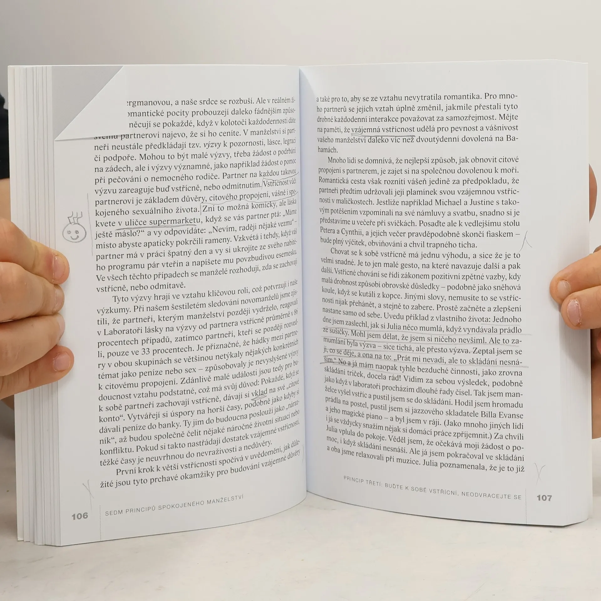 „Sedm principů spokojeného manželství“ představuje vrchol celoživotního díla amerického psychologa Johna Gottmana, jednoho z nejvlivnějších odborníků na manželství a rodičovství. Díky více než dvacetiletému výzkumu nabízí Gottman hluboký vhled do dynamiky partnerských vztahů. Autor zahájil svůj výzkum v roce 1992 se 700 novomanželskými páry, které si nahrávaly 15minutové rozhovory. Analýzou těchto záznamů předpověděl, zda páry vydrží dalších deset let, s úspěšností 94 %. Klíčovým faktorem pro úspěch vztahu se ukázal být poměr pozitivních a negativních interakcí, přičemž páry, které zůstaly spolu, měly pětkrát více pozitivních interakcí než negativních. Gottman se zaměřuje na mýty o komunikaci a identifikuje destruktivní vzorce, které mohou vést k rozchodu. Kniha obsahuje profily párů, které se dokázaly zachránit, a také příběhy těch, kteří proplouvají životem společně. Čtenáři najdou dotazníky a cvičení, které pomohou identifikovat problémy ve vztahu a zaměřit se na jejich řešení. První vydání knihy vyšlo v roce 1999 a stalo se bestsellerem, přičemž aktualizované vydání z roku 2015 přináší nejnovější výzkumy.
