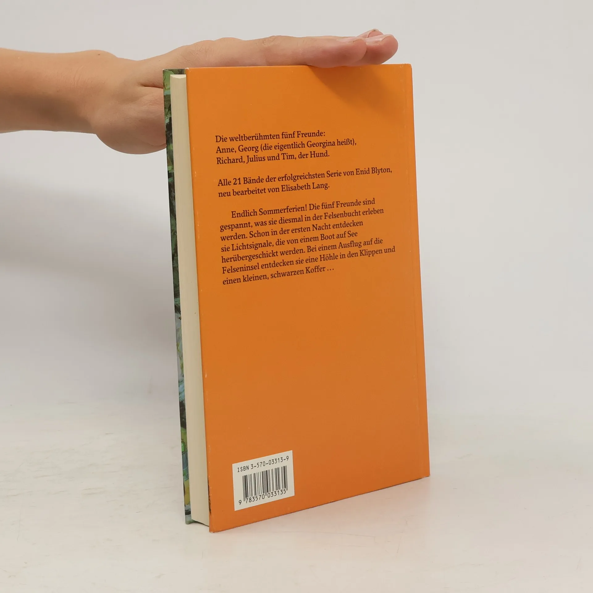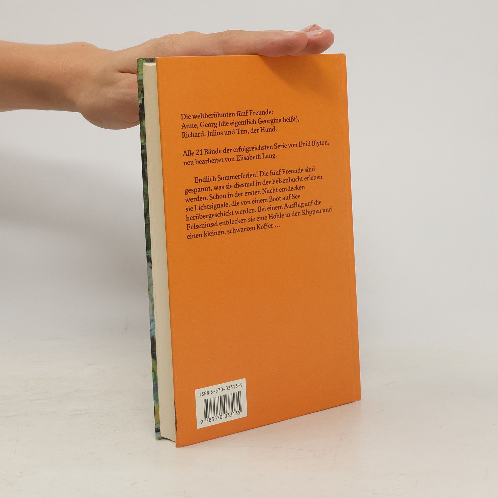 Die weltberühmten fünf Freunde: Anne, Georg (die eigentlich Georgina heißt), Richard, Julius und Tim, der Hund. Alle 21 Bände der erfolgreichsten Serie von Enid Blyton, neu bearbeitet von Elisabeth Lang. Endlich Sommerferien! Die fünf Freunde sind gespannt, was sie diesmal in der Felsenbucht erleben werden. Schon in der ersten Nacht entdecken sie Lichtsignale, die von einem Buch auf See herübergeschickt werden. Bei einem Ausflug auf die Felseninsel entdecken sie eine Höhle in den Klippen und einen kleinen, schwarzen Koffer.