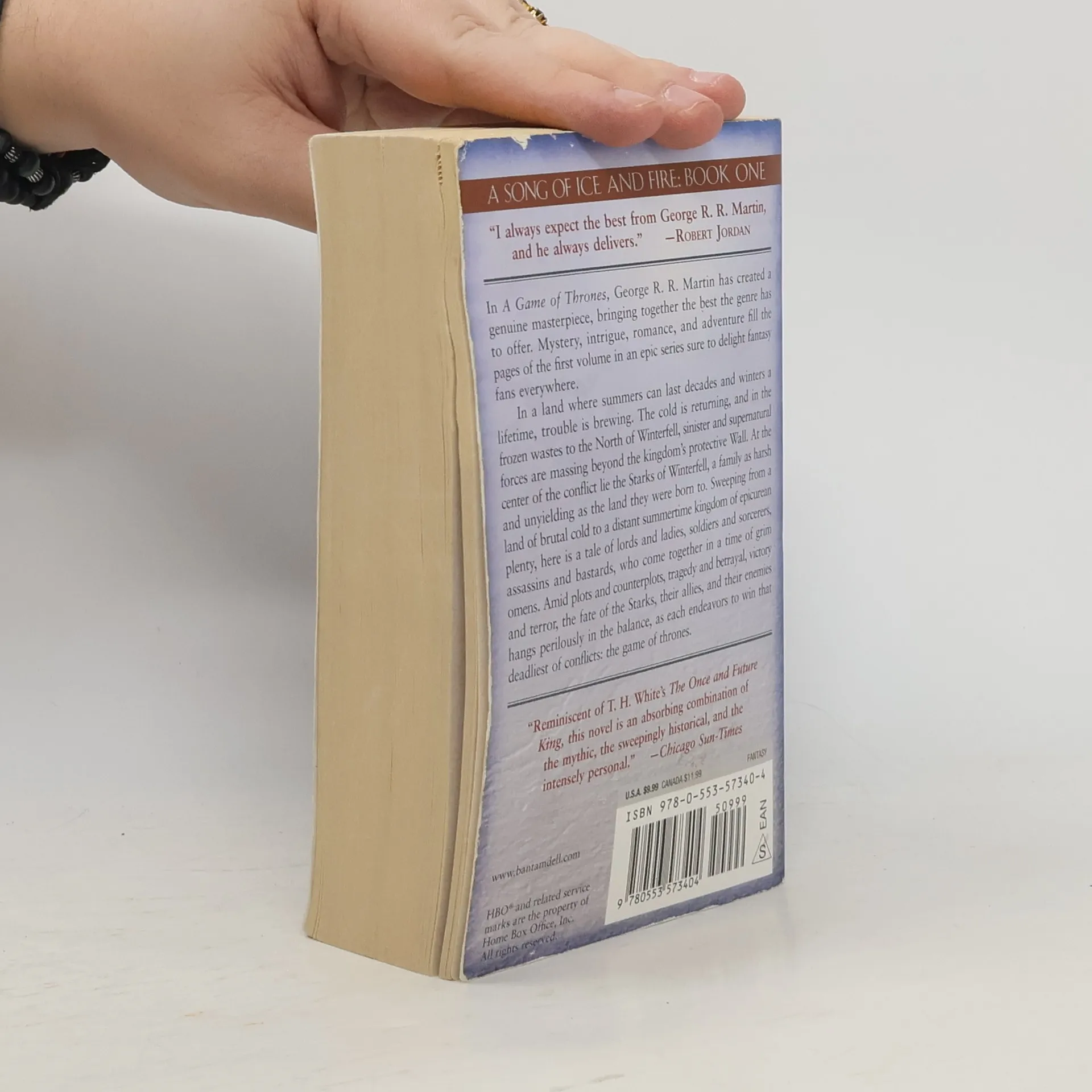 NOW THE ACCLAIMED HBO SERIES GAME OF THRONES—THE MASTERPIECE THAT BECAME A CULTURAL PHENOMENON Here is the first book in the landmark series that has redefined imaginative fiction and become a modern masterpiece. A GAME OF THRONES In a land where summers can last decades and winters a lifetime, trouble is brewing. The cold is returning, and in the frozen wastes to the North of Winterfell, sinister and supernatural forces are massing beyond the kingdom’s protective Wall. At the center of the conflict lie the Starks of Winterfell, a family as harsh and unyielding as the land they were born to. Sweeping from a land of brutal cold to a distant summertime kingdom of epicurean plenty, here is a tale of lords and ladies, soldiers and sorcerers, assassins and bastards, who come together in a time of grim omens. Amid plots and counterplots, tragedy and betrayal, victory and terror, the fate of the Starks, their allies, and their enemies hangs perilously in the balance, as each endeavors to win that deadliest of conflicts: the game of thrones. A GAME OF THRONES • A CLASH OF KINGS • A STORM OF SWORDS • A FEAST FOR CROWS • A DANCE WITH DRAGONS