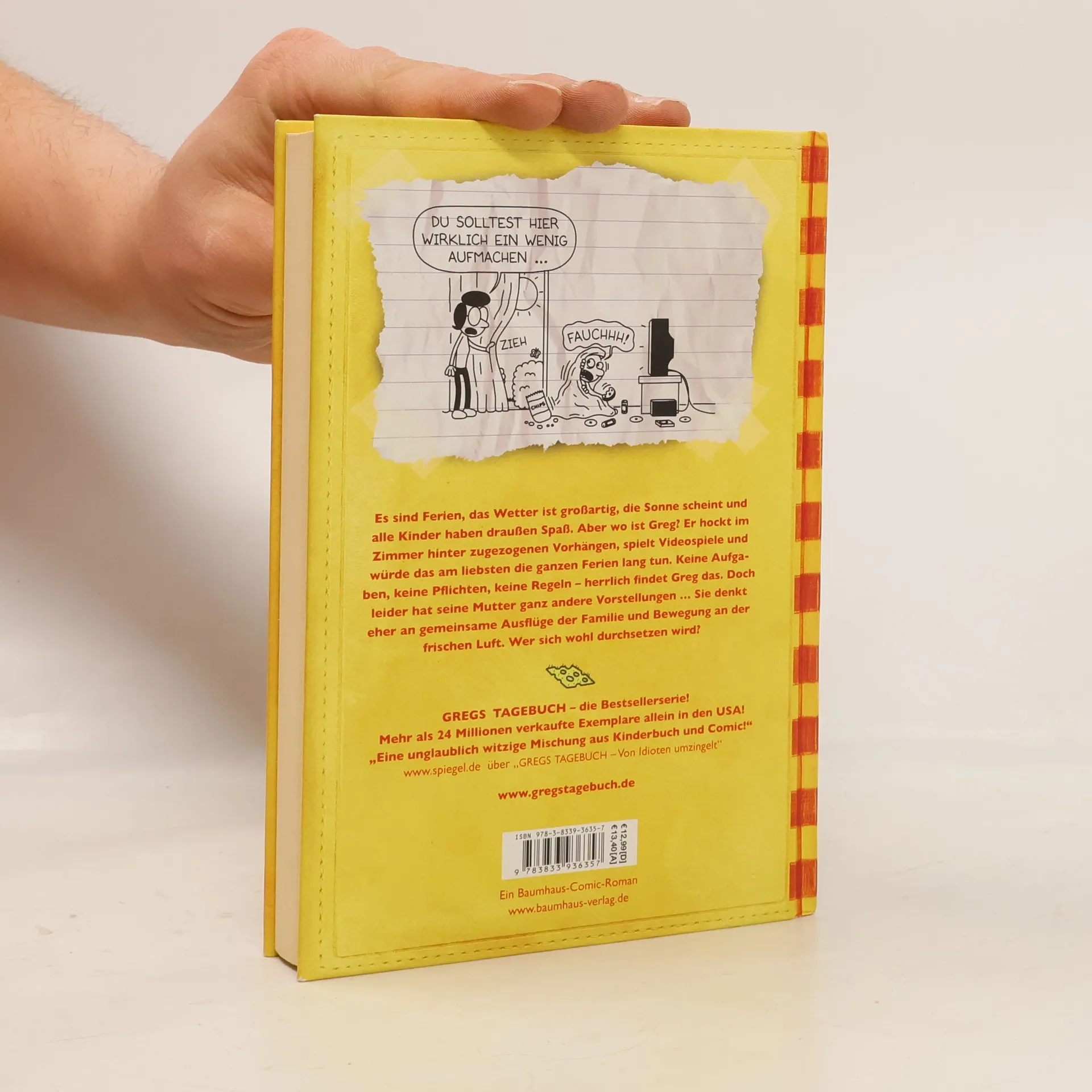 "Es sind Ferien, das Wetter ist großartig, die Sonne scheint und alle Kinder haben draußen Spaß. Aber wo ist Greg? Er hockt im Zimmer hinter zugezogenen Vorhängen, spielt Videospiele und würde das am liebsten die ganzen Ferien lang tun. Keine Aufgaben, keine Pflichten, keine Regeln - herrlich findet Greg das. Doch leider hat seine Mutter ganz andere Vorstellungen ... Sie denkt eher an gemeinsame Ausflüge mit der Familie und Bewegung an der frischen Luft. Wer sich wohl durchsetzen wird?" (Verlagsangabe)