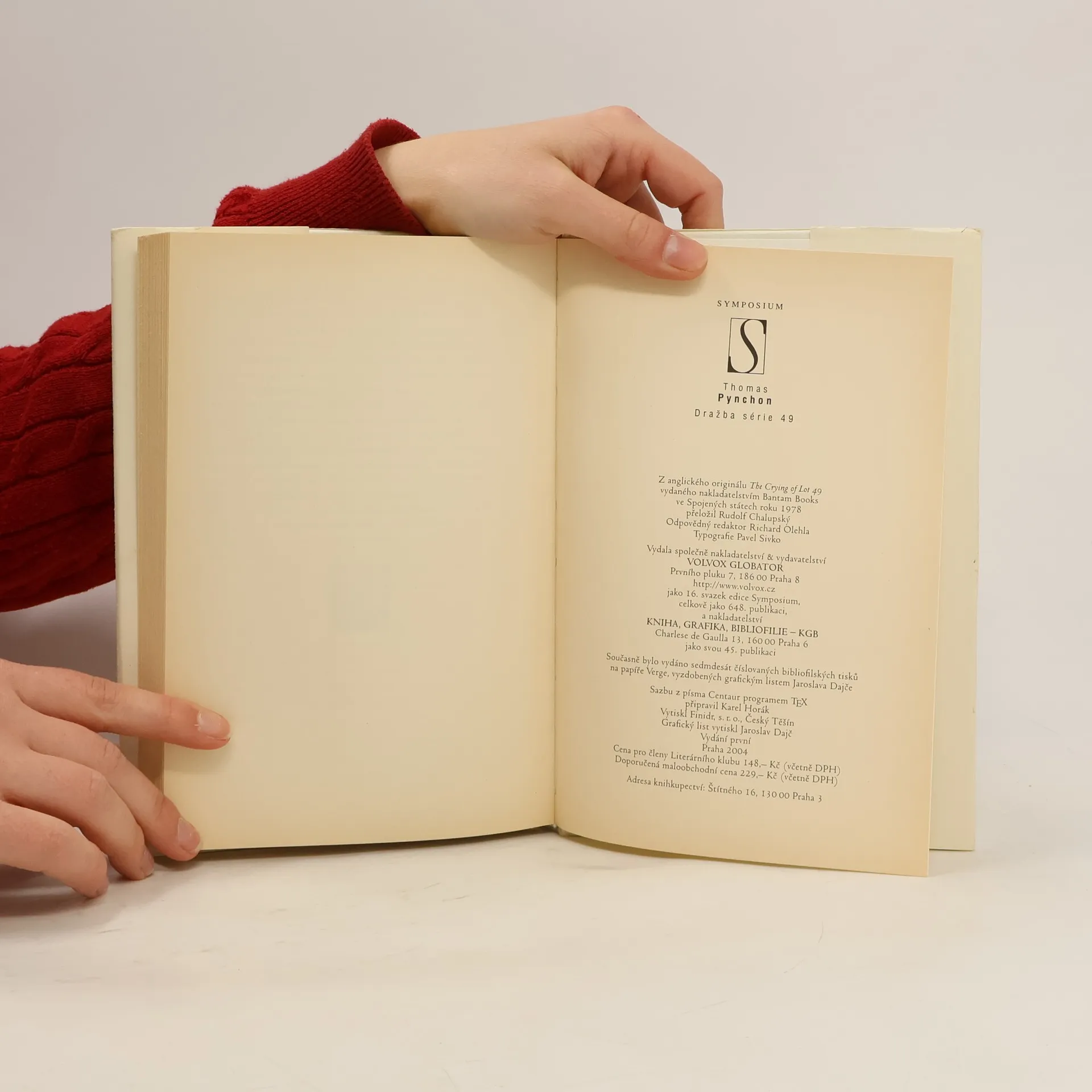 Pokud získáte při četbě této knihy pocit, že to, co právě držíte v rukou, je patologické, obsesivní a snad i šílené, tak jste právě trefili do černého. Taková je Dražba série 49 – předehra pro volné po-kračování mistrovské Duhy přitažlivosti – slatina slovních hříček, jemné satiry, inteligentního jazyka a výjimečného humoru. Vyprávěním se jako tenká nit line hranice mezi tím, co představuje gnostic-ké šílenství a co jen pomyslný krůček k šílenství, a v tom osciluje hlavní hrdinka Oidipa Maasová, vykonavatelka závěti svého zesnulého milence, žalostně a téměř paranoidně toužící po alternativní komunikaci. Tato Pynchonova práce je mnohými odborníky považována za naprostý vypravěčský triumf, za okultní knihu se zápletkou na hranici surrealismu, plnou tajemné a zastřené symboliky, jíž dominuje záhadná organizace Trystero, a současně za jemný náčrt roztříštěnosti americké kul-tury posedlé konspirací.