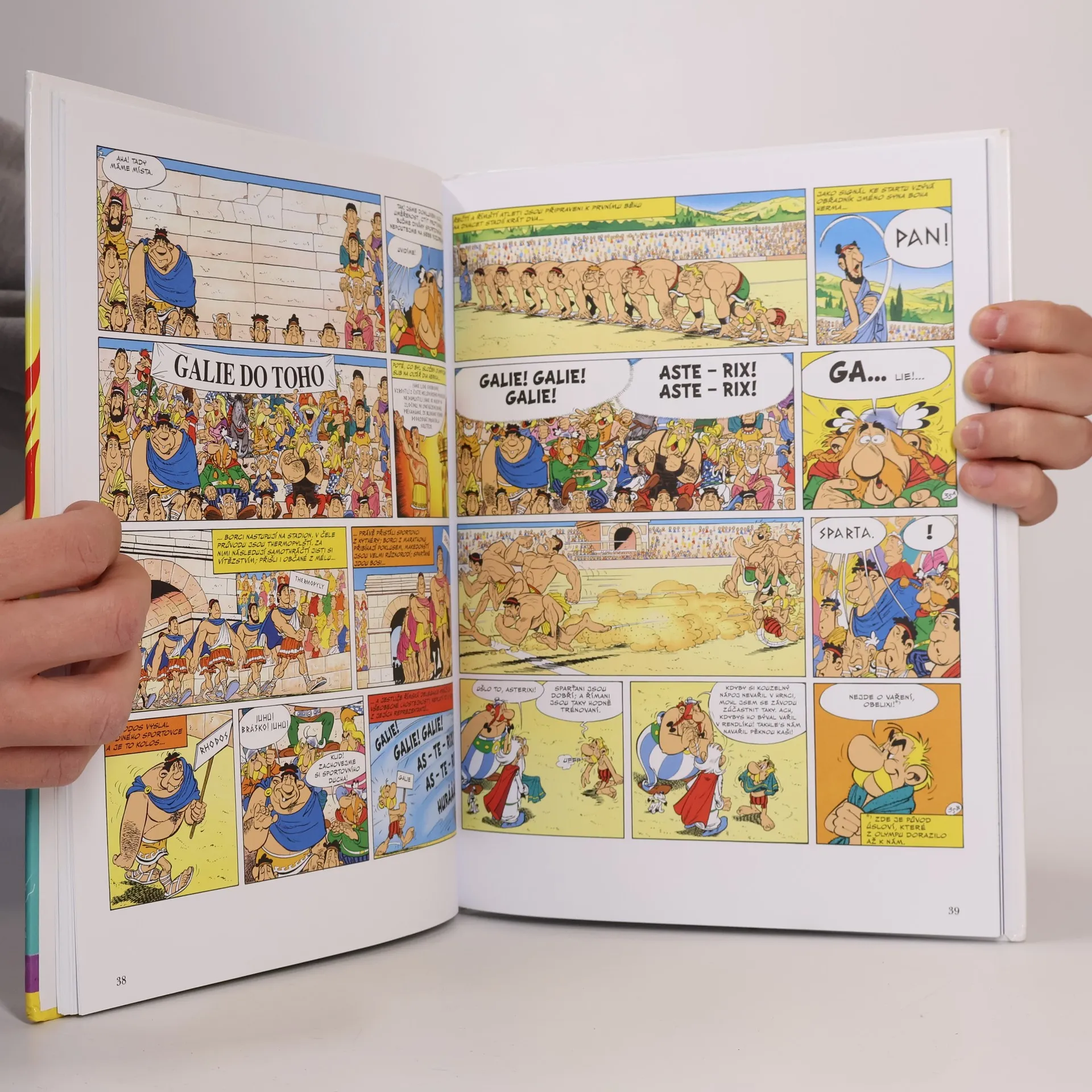 Humorný obrázkový seriál ze starověké Galie, okupované Římem, ve kterém vystupuje opět Asterix a další známé postavičky. Obyvatelé galské obce se rozhodnou, že se zúčastní olympijských her. Proti trénovaným Řekům však nemají naději a tak použijí lsti.
