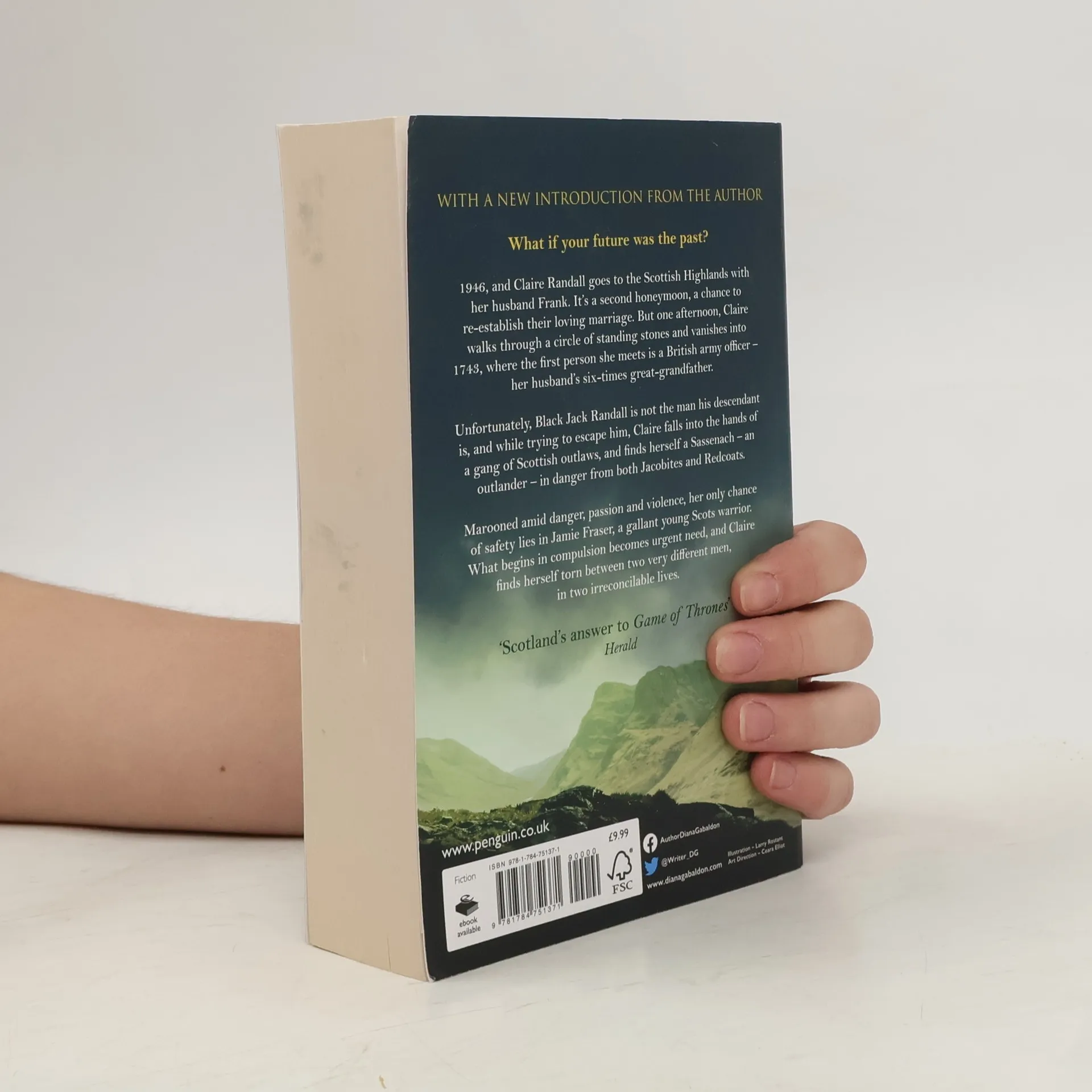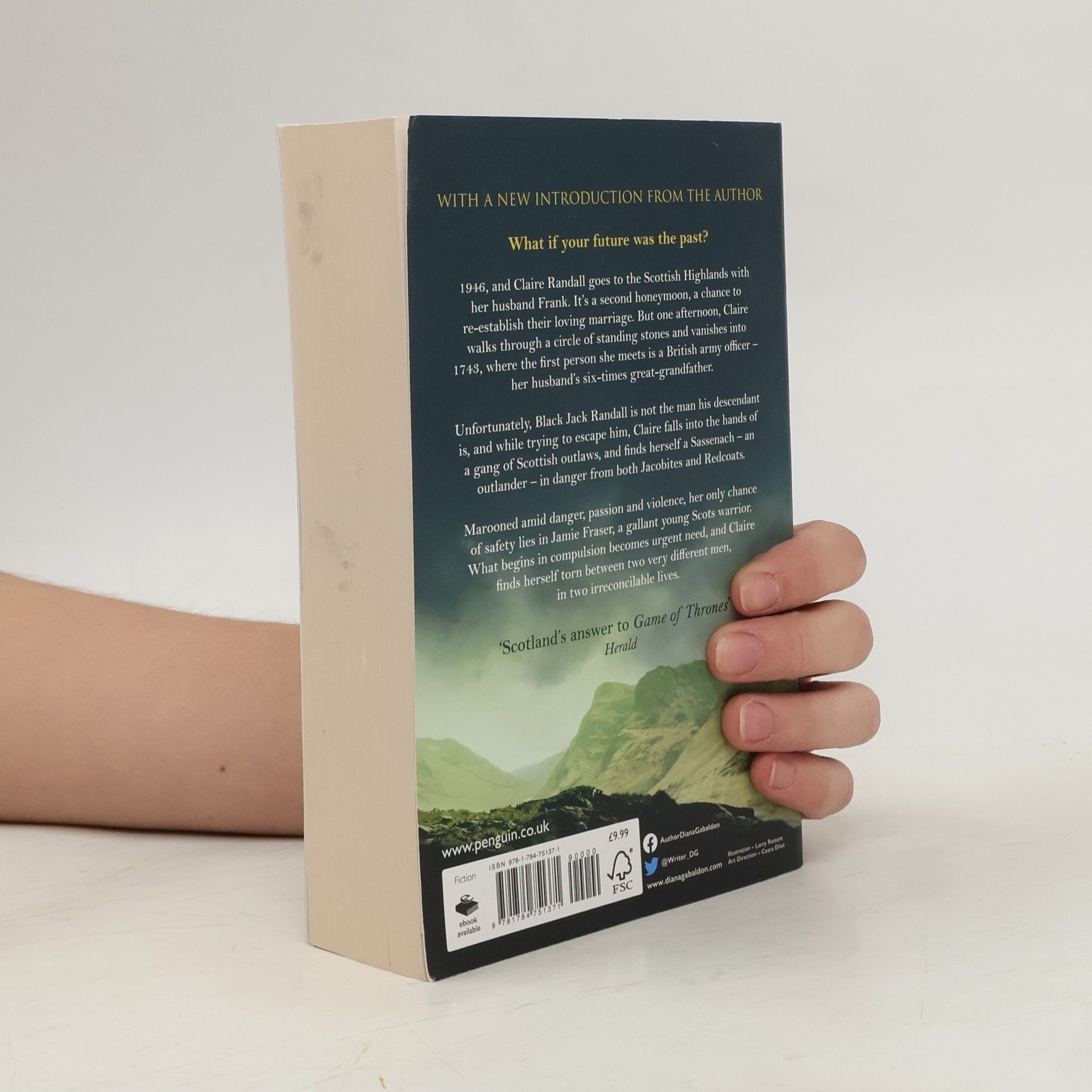 'Scotland's answer to Game of Thrones' Herald THE FIRST NOVEL IN THE BESTSELLING OUTLANDER SERIES. As seen on Amazon Prime TV. What if your future was the past? 1946, and Claire Randall goes to the Scottish Highlands with her husband Frank. It's a second honeymoon, a chance to learn how war has changed them and to re-establish their loving marriage. But one afternoon, Claire walks through a circle of standing stones and vanishes into 1743, where the first person she meets is a British army officer - her husband's six-times great-grandfather. Unfortunately, Black Jack Randall is not the man his descendant is, and while trying to escape him, Claire falls into the hands of a gang of Scottish outlaws, and finds herself a Sassenach - an outlander - in danger from both Jacobites and Redcoats. Marooned amid danger, passion and violence, her only chance of safety lies in Jamie Fraser, a gallant young Scots warrior. What begins in compulsion becomes urgent need, and Claire finds herself torn between two very different men, in two irreconcilable lives. (Previously published as Cross Stitch)