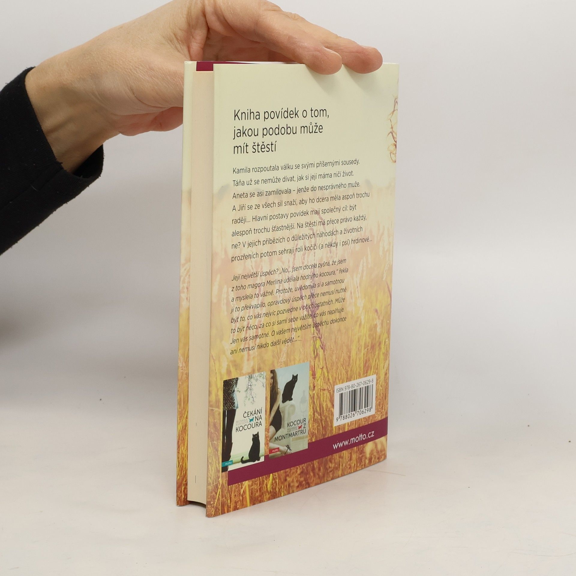 Kamila rozpoutala válku se svými příšernými sousedy. Táňa už se nemůže dívat, jak si její máma ničí život. Aneta se asi zamilovala – jenže do nesprávného muže. A Jiří se ze všech sil snaží, aby ho dcera měla aspoň trochu raději... Hlavní postavy povídek mají společný cíl: být alespoň trochu šťastnější. Na štěstí má přece právo každý, ne? V jejich příbězích o důležitých náhodách a životních prozřeních potom sehrají roli kočičí (a někdy i psí) hrdinové... Autorka ke knize dodává: Opravdový úspěch přece nemusí nutně být to, co vás nejvíc pozvedne v očích ostatních. Může to být něco, za co si sami sebe vážíte, co vás naplňuje. Jen vás samotné. nemusí nikdo další vědět...“