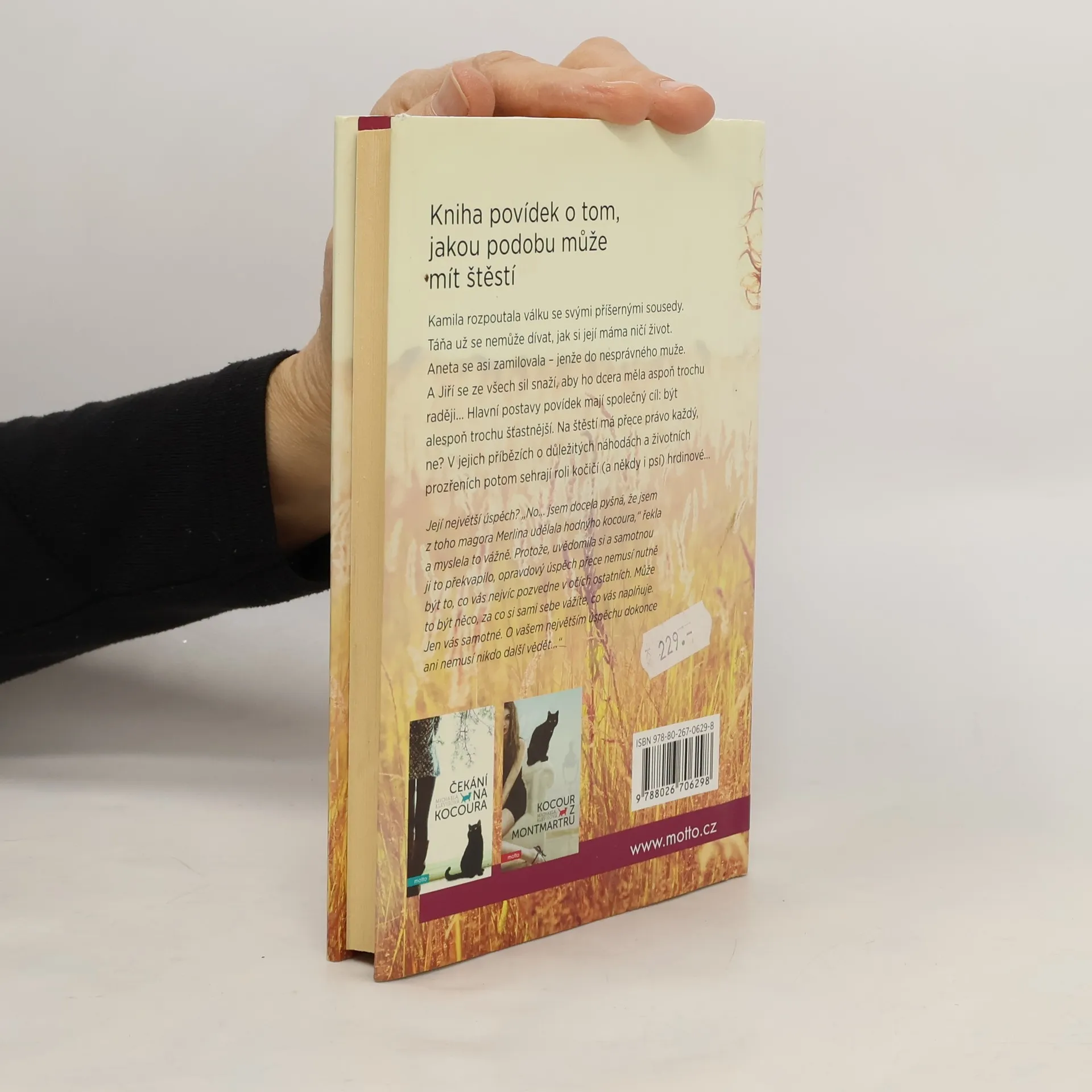 Kamila rozpoutala válku se svými příšernými sousedy. Táňa už se nemůže dívat, jak si její máma ničí život. Aneta se asi zamilovala – jenže do nesprávného muže. A Jiří se ze všech sil snaží, aby ho dcera měla aspoň trochu raději... Hlavní postavy povídek mají společný cíl: být alespoň trochu šťastnější. Na štěstí má přece právo každý, ne? V jejich příbězích o důležitých náhodách a životních prozřeních potom sehrají roli kočičí (a někdy i psí) hrdinové... Autorka ke knize dodává: Opravdový úspěch přece nemusí nutně být to, co vás nejvíc pozvedne v očích ostatních. Může to být něco, za co si sami sebe vážíte, co vás naplňuje. Jen vás samotné. nemusí nikdo další vědět...“