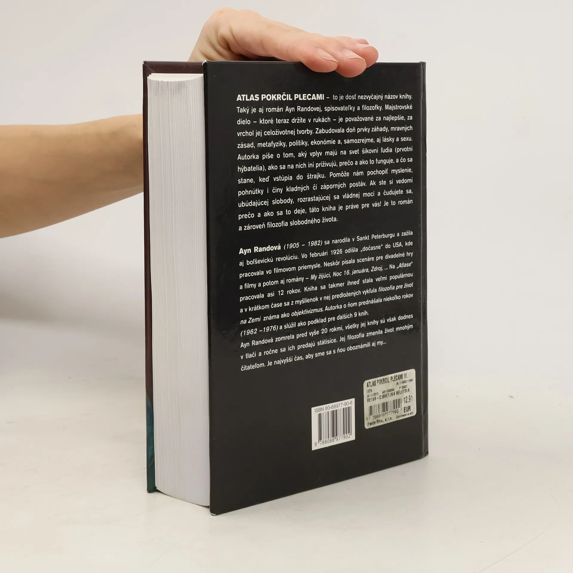 Atlas pokrčil pokrčil – to je dosť nezvyčajný názov knihy. Taký je aj Ayn Randovej, spisovateľky a filozofky. Toto dielo je považované za najlepšie, za vrchol jej celoživotnej tvorby. Zabudovala doň prvky záhady, mravných zásad, metafyziky, politiky, ekonómie, a samozrejme, aj lásky a sexu. Autorka píše o tom, aký vplyv majú na svet šikovní ľudia (prvotní hýbatelia), ako sa na nich iní priživujú, prečo a ako to funguje, a čo sa stane, keď vstúpia do štrajku. Pomôže nám pochopiť myslenie, pohnútky i činy kladných či záporných postáv. Ak ste si vedomí ubúdajúcej slobody, rozrastajúcej sa vládnej moci a čudujete sa, prečo a ako sa to deje, táto kniha je práve pre vás! Je to román a zároveň filozofia slobodného života.