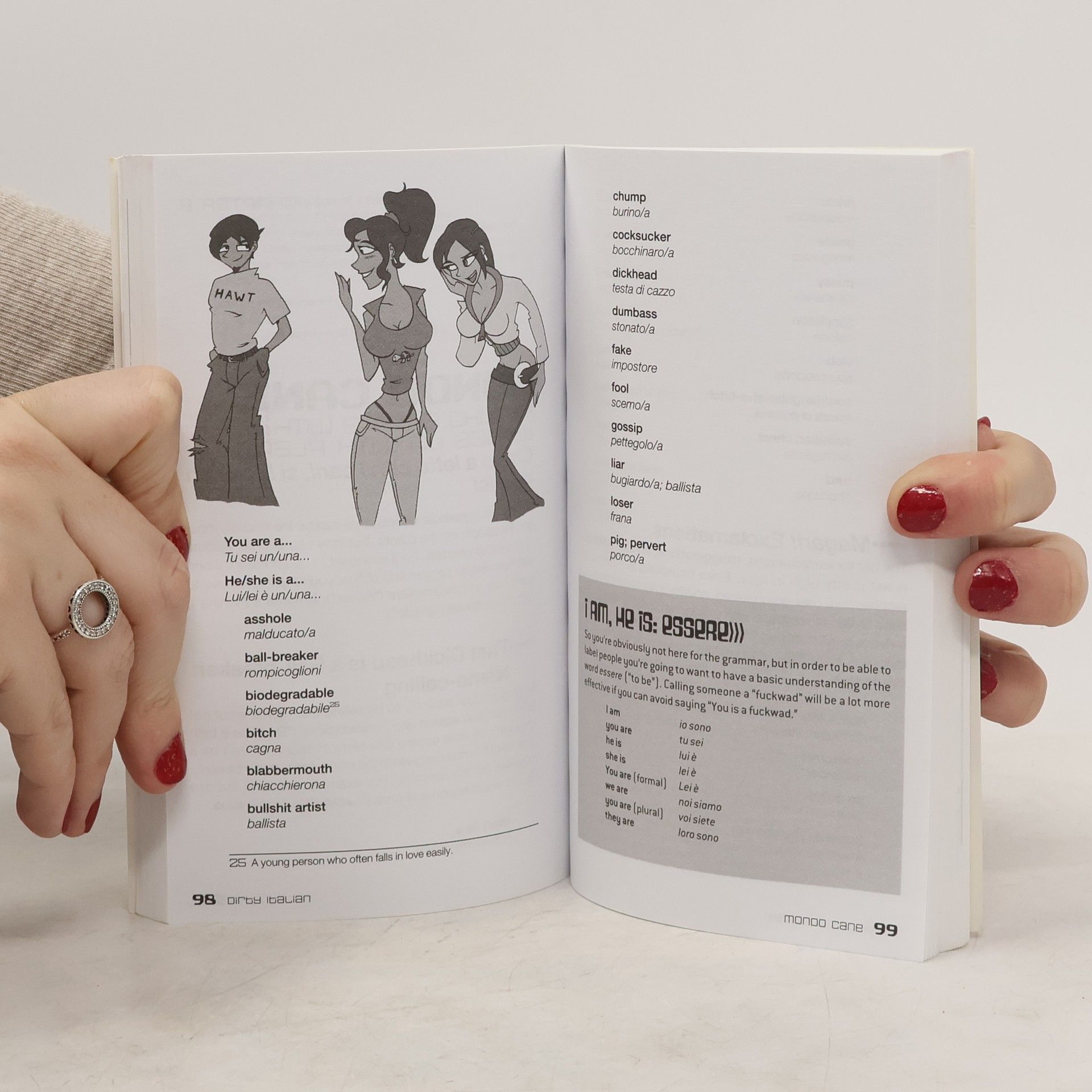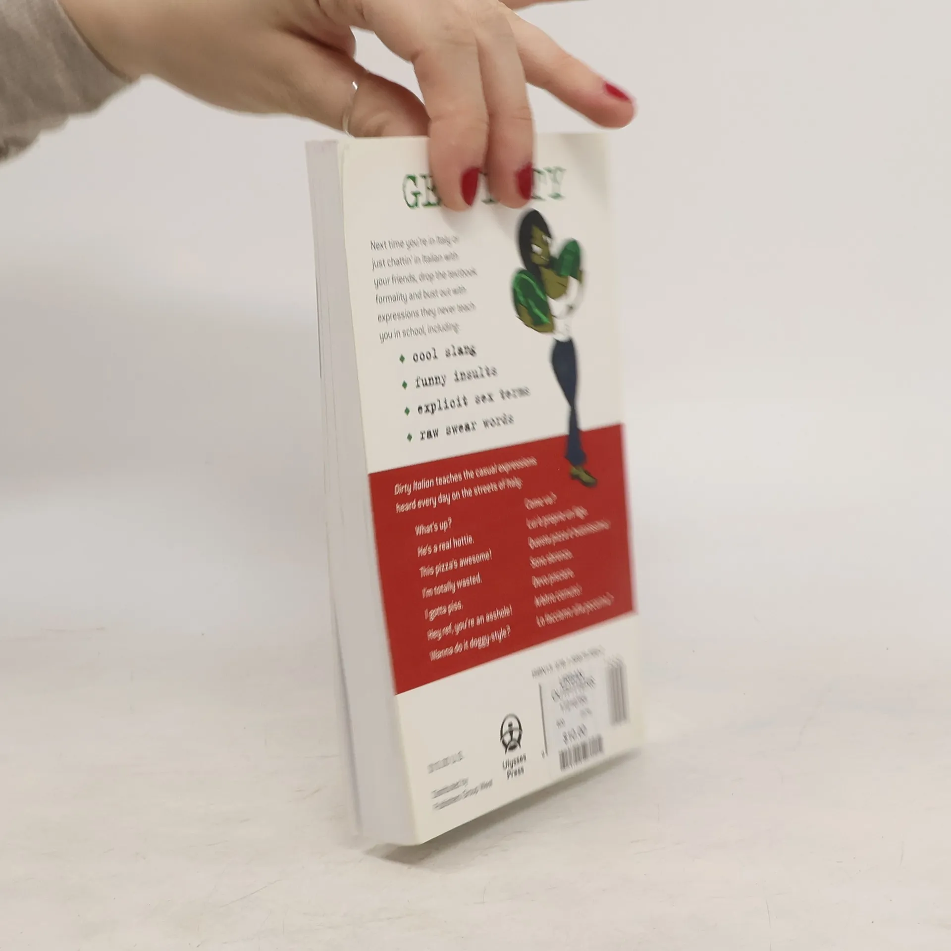 GET D!RTYNext time you’re traveling or just chattin’ in Italian with your friends, drop the textbook formality and bust out with expressions they never teach you in school, including: Cool slang Funny insults Explicit sex terms Raw swear words Dirty Italian teaches the casual expressions heard every day on the streets of Italy:What's up?Come va?He's a real hottie.Lui è proprio un figo.This pizza's awesome!Questa pizza è buonissima!I'm totally wasted.Soo sbronzo.I gotta piss.Devo pisciare.Hey ref, you're an asshole!Arbitro cornuto!Wanna do it doggy-style?Lo facciamo alla pecorina?