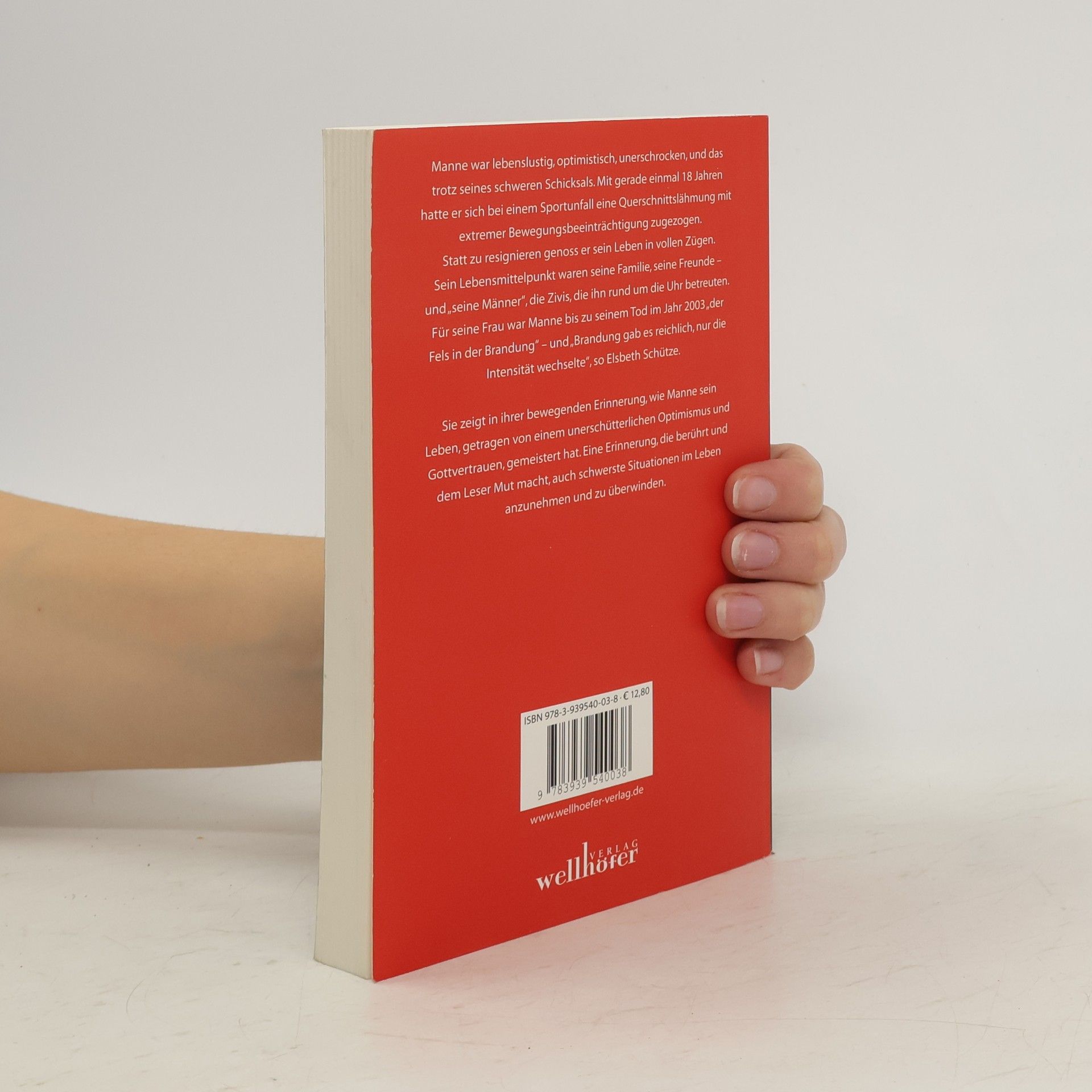 Manne war lebenslustig, optimistisch, unerschrocken, und das trotz seines schweren Schicksals. Mit gerade einmal 18 Jahren hatte er sich bei einem Sportunfall eine Querschnittslähmung mit extremer Bewegungsbeeinträchtigung zugezogen. Statt zu resignieren genoss er sein Leben in vollen Zügen. Sein Lebensmittelpunkt waren seine Familie, seine Freunde und seine Männer, die Zivis, die ihn rund um die Uhr betreuten. Für seine Frau war Manne bis zu seinem Tod im Jahr 2003 der Fels in der Brandung und Brandung gab es reichlich, nur die Intensität wechselte, so Elsbeth Schütze. Sie zeigt in ihrer bewegenden Erinnerung, wie Manne sein Leben, getragen von einem unerschütterlichen Optimismus und Gottvertrauen, gemeistert hat. Eine Erinnerung, die berührt und dem Leser Mut macht, auch schwerste Situationen im Leben anzunehmen und zu überwinden.