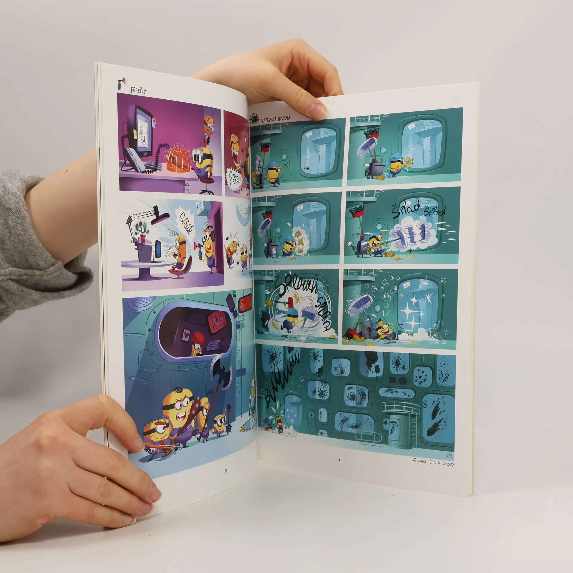 Přicházejí Mimoni! Jak na filmové plátno, tak na komiksové stránky! A zatímco ve filmu se seznámíme s jejich začátky, s jejich přicestováním do Ameriky a s rozjetím kariéry coby superpadoušských poskoků (on je taky jejich původní název Minions, čili takoví ti podržtaškové zločineckých bossů - ale ti čeští "Mimoňi" jim možná sedí více, hlavně když uvážíme jejich úspěšnost), tak komiksová série je už zachycuje v tom nejlepším. Pokud se dá u Mimoňů o tom nejlepším vůbec mluvit. Komiksová série je složená z jednostránkových vypointovaných epizod, které jsou zcela beze slov, takže si komiks můžou užít i ti nejmenší čtenáři... ovšem díky skvělým fórům a lahůdkovému grafickému zpracování potěší i ty odrostlejší.