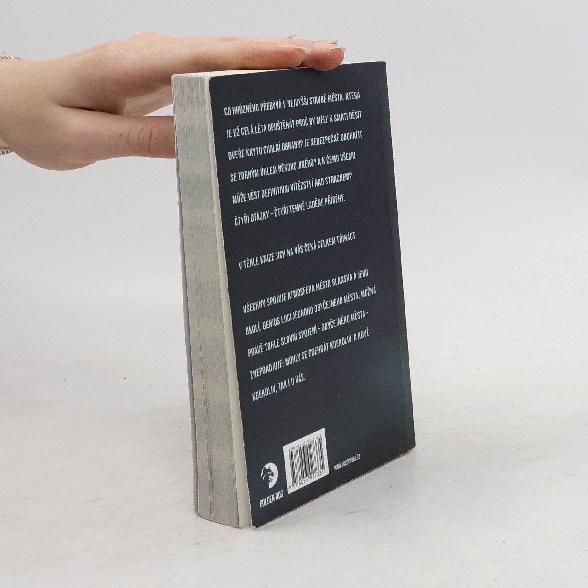 Co hrůzného přebývá v nejvyšší stavbě města, která je už celá léta opuštěná? Proč by měly k smrti děsit dveře krytu civilní obrany? Je nebezpečné obohatit se zorným úhlem někoho jiného? A k čemu všemu může vést definitivní vítězství nad strachem? Čtyři otázky – čtyři temně laděné příběhy. V téhle knize jich na vás čeká celkem třináct. Všechny spojuje atmosféra města Blanska a jeho okolí, genius loci jednoho obyčejného města. Možná právě tohle slovní spojení – obyčejného města – znepokojuje: mohly se odehrát kdekoliv, a když kdekoliv, tak i u vás.
