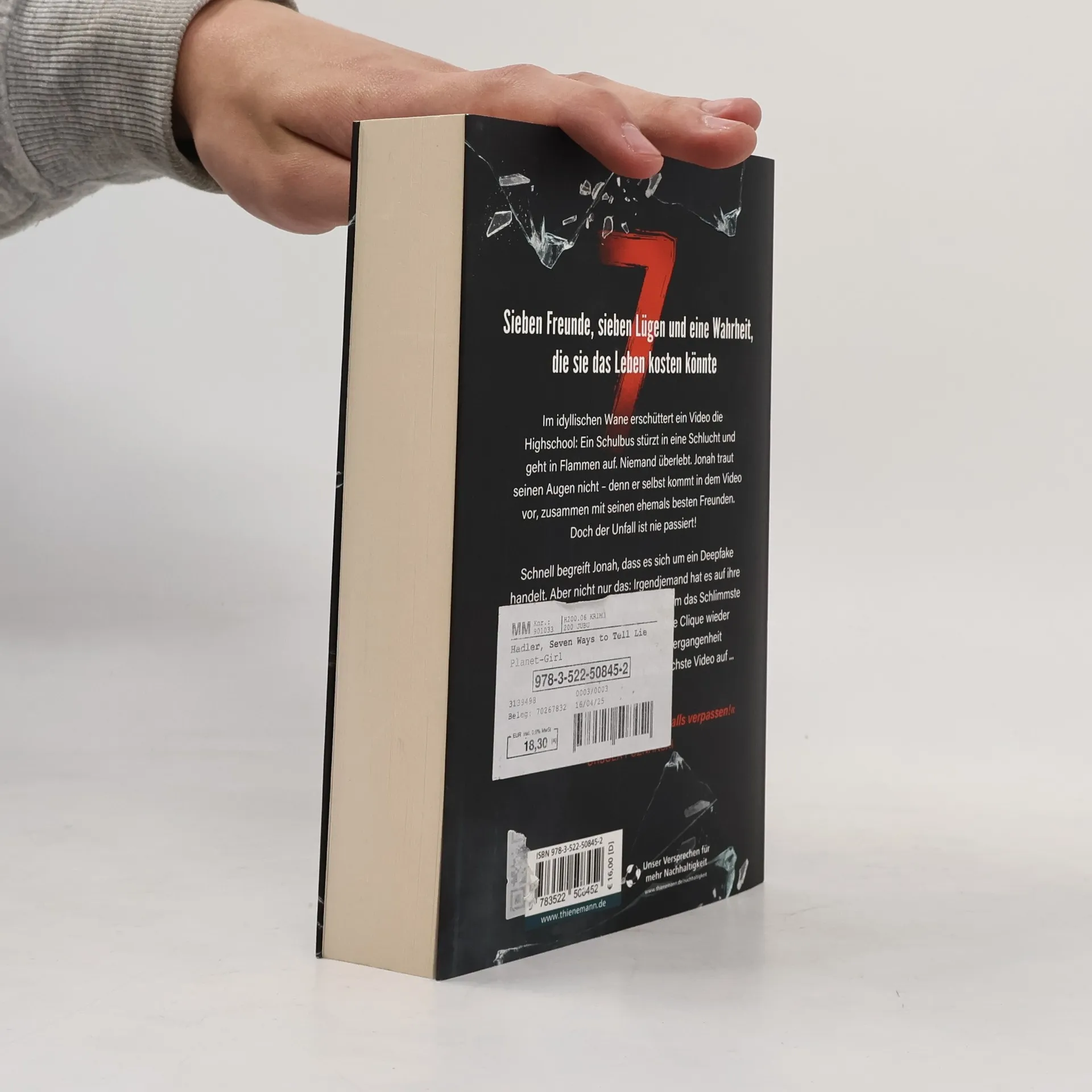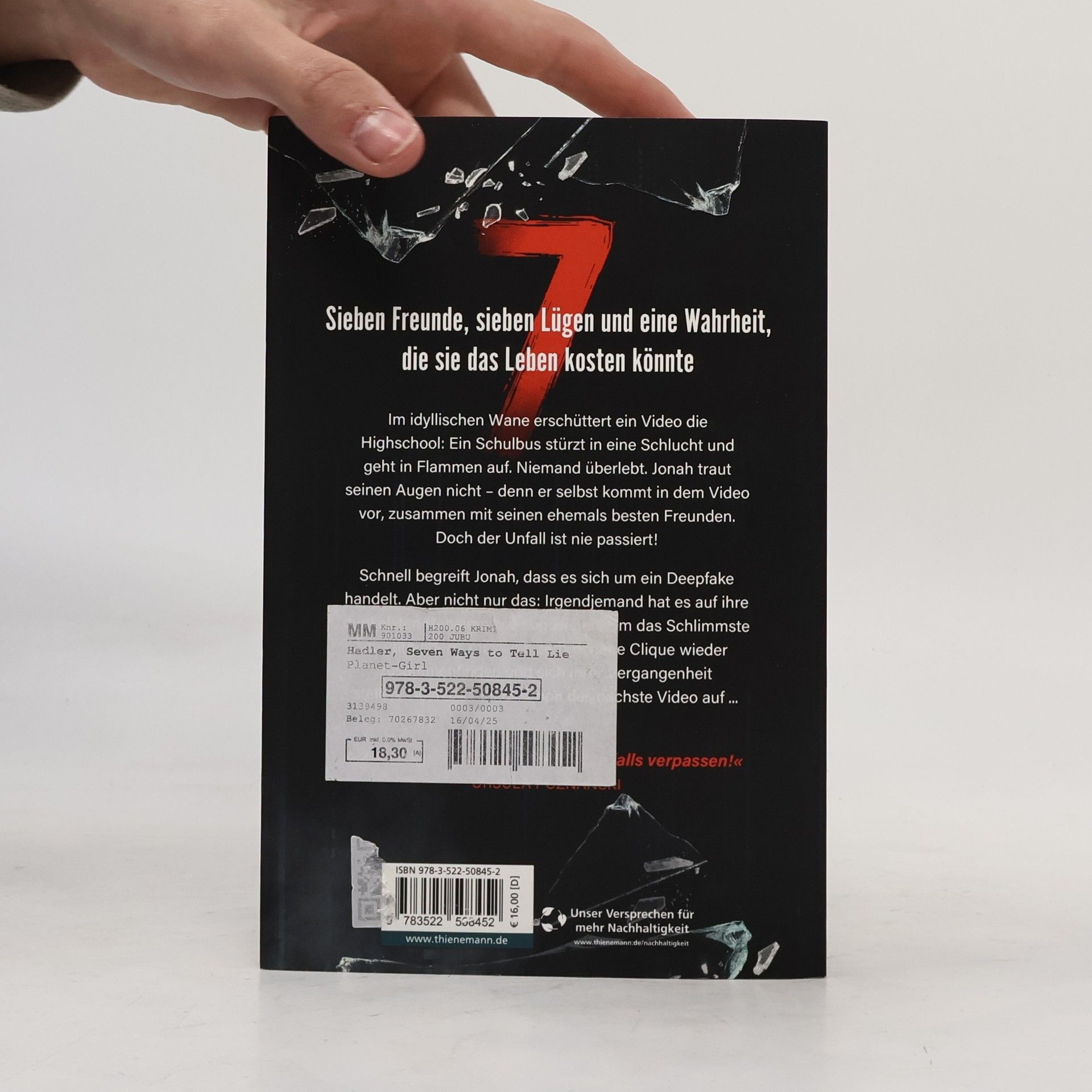 Sieben Freunde, sieben Lügen und eine Wahrheit, die sie das Leben kosten könnte In der idyllischen Kleinstadt Wane erschüttert ein Video die Highschool: Ein Schulbus stürzt in eine Schlucht und geht in Flammen auf. Niemand überlebt. Jonah traut seinen Augen nicht – denn er selbst kommt in dem Video vor, zusammen mit seinen ehemals besten Freunden. Doch der Unfall ist nie passiert! Schnell begreift Jonah, dass es sich um ein Deepfake handelt. Aber nicht nur das: Irgendjemand hat es auf ihre dunkelsten Geheimnisse abgesehen. Um das Schlimmste zu verhindern, muss die zerbrochene Clique wieder zusammenfinden und sich ihrer Vergangenheit stellen. Doch da taucht schon das nächste Video auf ... Der neue All-Age-Thriller von Colin Hadler! "Ein absoluter Pageturner, keinesfalls verpassen!" Ursula Poznanski