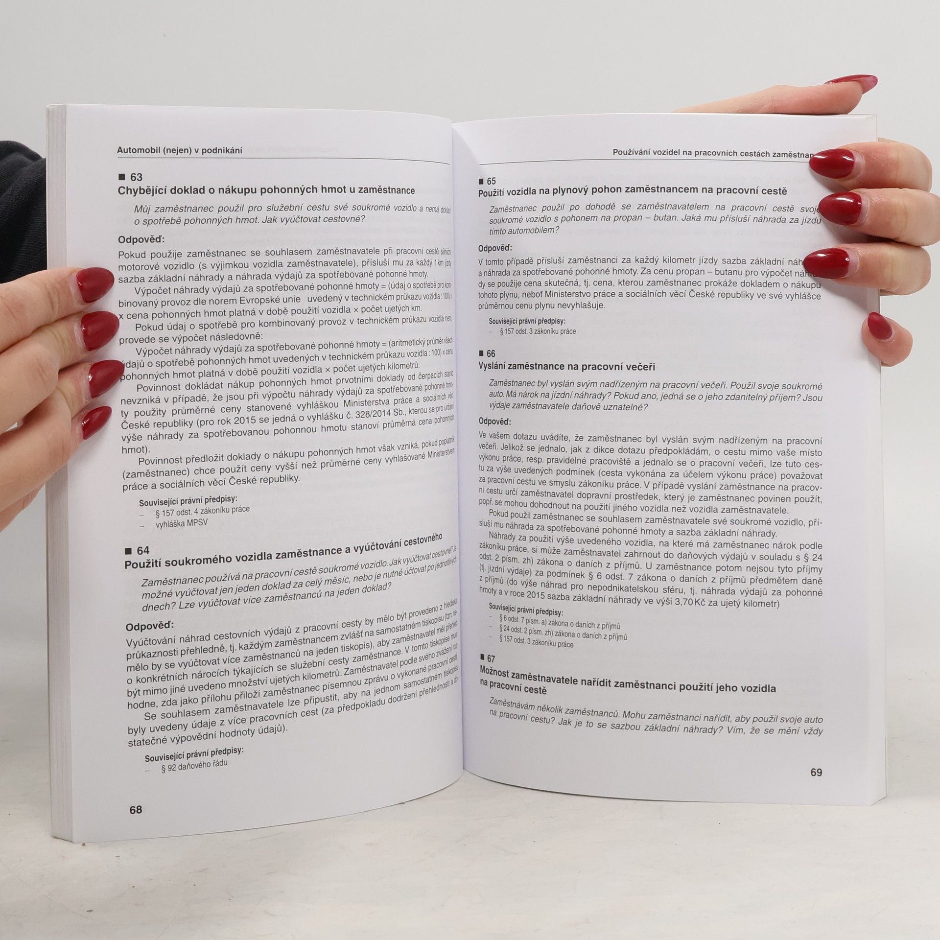 Hlavním tématem knihy je problematika spojená s pořízením a používáním vozidel v souvislosti s podnikatelskou činností. Obsahuje 130 otázek a odpovědí z praxe od renomovaných autorů (autorek) ze státní i soukromé sféry. Velkým kladem této knihy je široké spektrum otázek týkajících se daňové problematiky spojené s používáním automobilů a dále cestovních náhrad (náhrada jízdních výdajů). Kromě problematiky týkající se daně z příjmů je velký prostor v knize věnován také otázkám týkajících se DPH a daně silniční. V knize jsou řešeny i otázky nedaňového charakteru související s provozem vozidel (např. postup v případě havárie). Výhodou této knihy je to, že se jedná o dotazy z praxe, které nebyly „uměle“ vytvořeny autory. V knize jsou uvedeny ustanovení některých zákonů, které se přímo či nepřímo dotýkají vozidel Otázky jsou roztříděné do 16 tematických okruhů.
