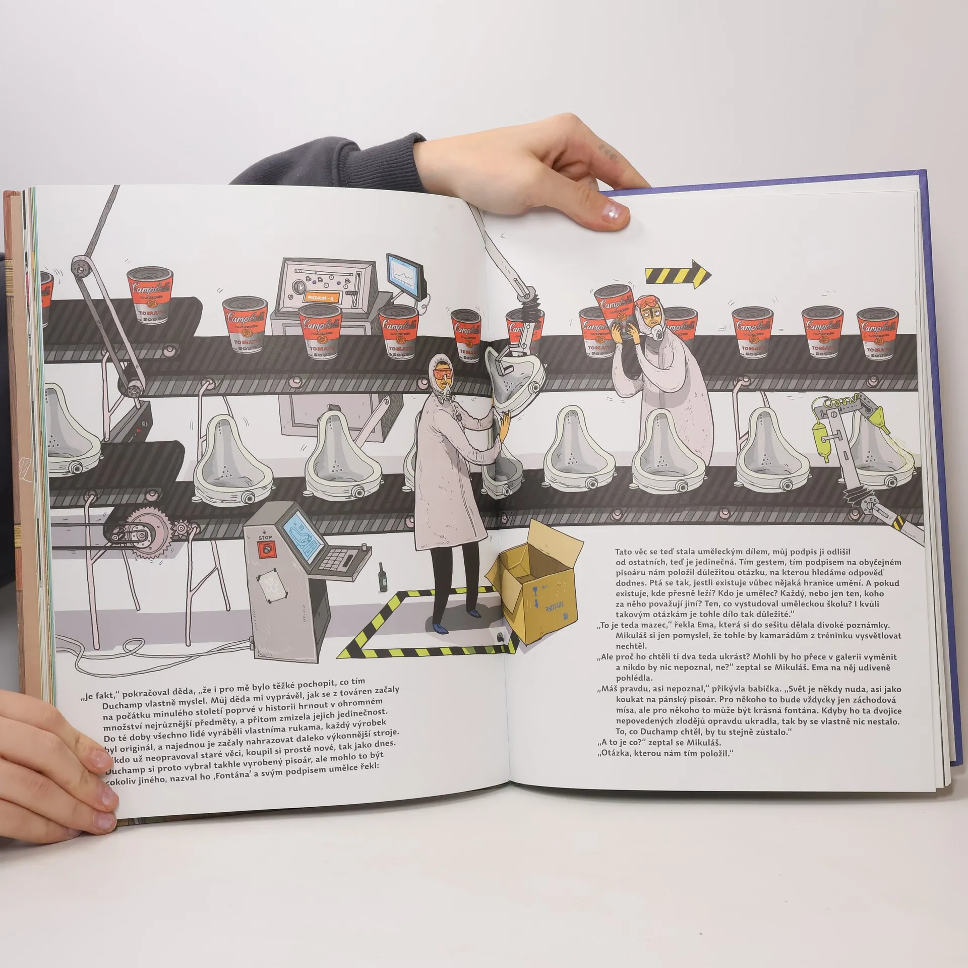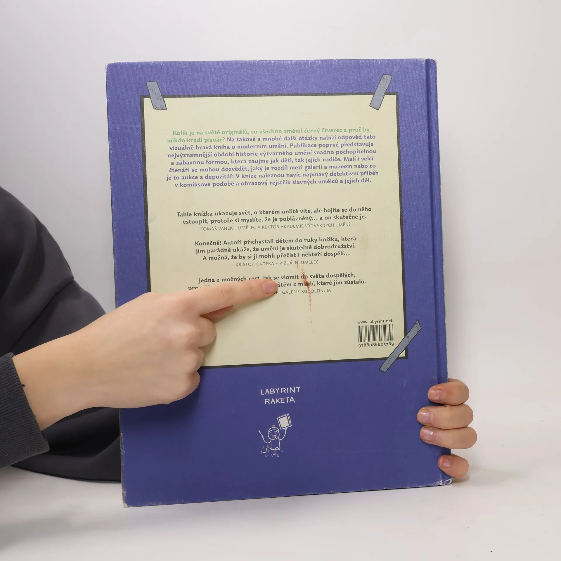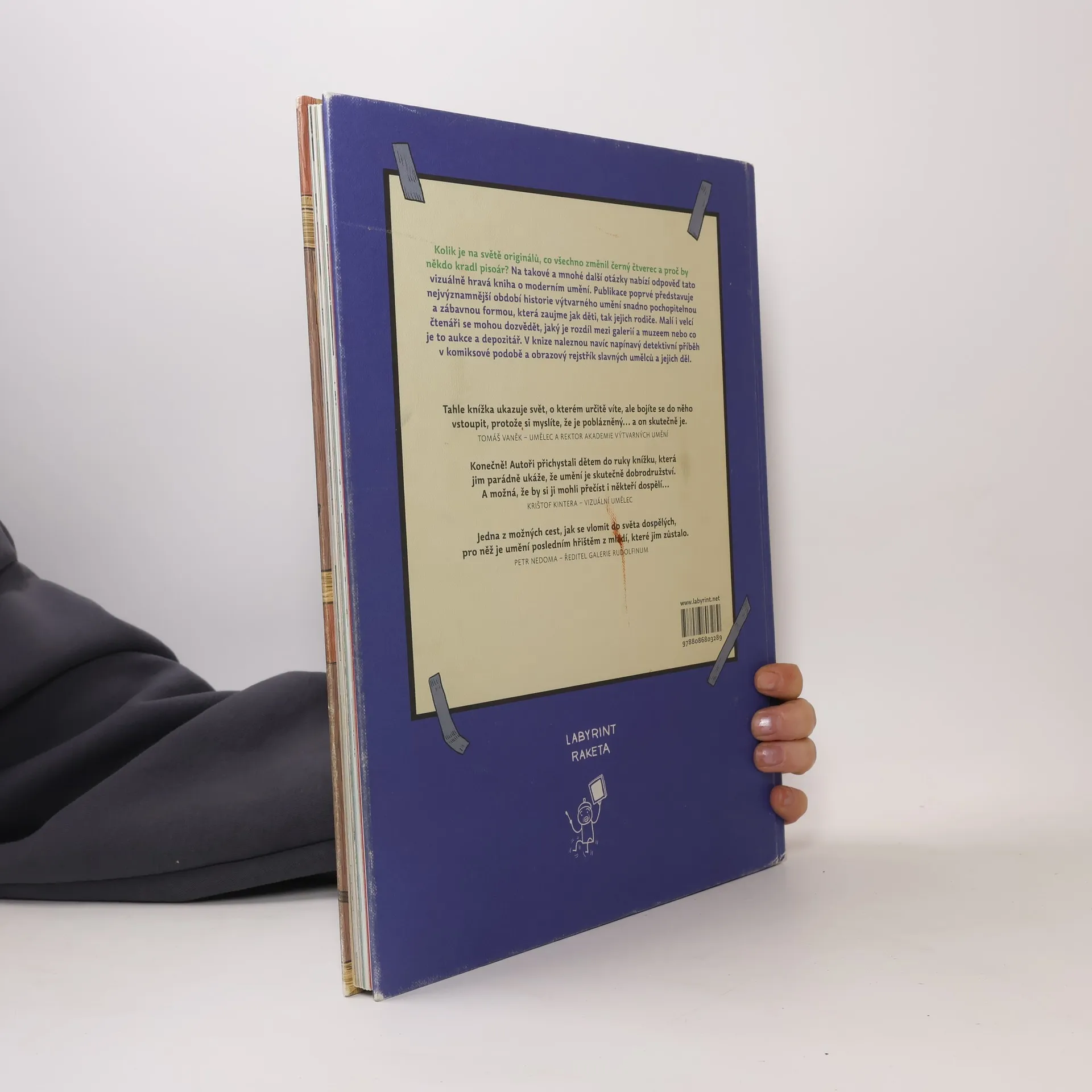Kolik je na světě originálů, co všechno změnil černý čtverec a proč by někdo kradl pisoár? Na takové a mnohé další otázky nabízí odpověď tato vizuálně hravá kniha o moderním umění. Publikace poprvé představuje nejvýznamnější období historie výtvarného umění snadno pochopitelnou a zábavnou formou, která zaujme jak děti, tak jejich rodiče. Malí i velcí čtenáři se mohou dozvědět, jaký je rozdíl mezi galerií a muzeem nebo co je to aukce a depozitář. V knize naleznou navíc napínavý detektivní příběh v komiksové podobě a obrazový rejstřík slavných umělců a jejich děl.