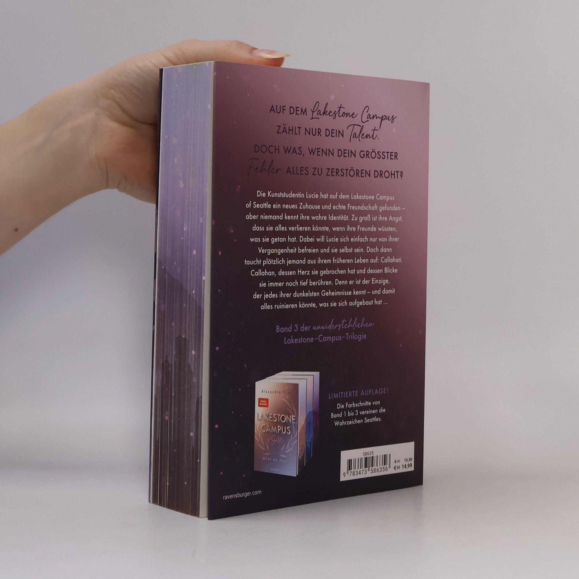 ***Limitierte Auflage mit farbigem Buchschnitt! Nur solange der Vorrat reicht!*** Die Kunststudentin Lucie hat auf dem Lakestone Campus ein Zuhause und echte Freundschaft gefunden – aber niemand kennt ihre wahre Identität. Zu groß ist ihre Angst, alles zu verlieren, wenn ihre Freunde wüssten, was sie getan hat. Dabei will Lucie einfach nur sie selbst sein. Doch dann taucht plötzlich jemand aus ihrem früheren Leben auf: Callahan. Callahan, dessen Herz sie gebrochen hat und dessen Blicke sie tief berühren. Denn er ist der Einzige, der jedes ihrer dunkelsten Geheimnisse kennt … Mitreißend. Knisternd. Unwiderstehlich. Der letzte Band der neuen New-Adult-Trilogie von SPIEGEL-Bestsellerautorin Alexandra Flint. Die Bücher der Lakestone-Campus-Reihe: Band 1: What We Fear Band 2: What We Lost (Herbst 2024) Band 3: What We Hide (Frühjahr 2025) Weitere fesselnde New-Adult-Romance der Autorin bei Ravensburger: Maple-Creek-Dilogie Band 1: Meet Me in Maple Creek Band 2: Save Me in Maple Creek