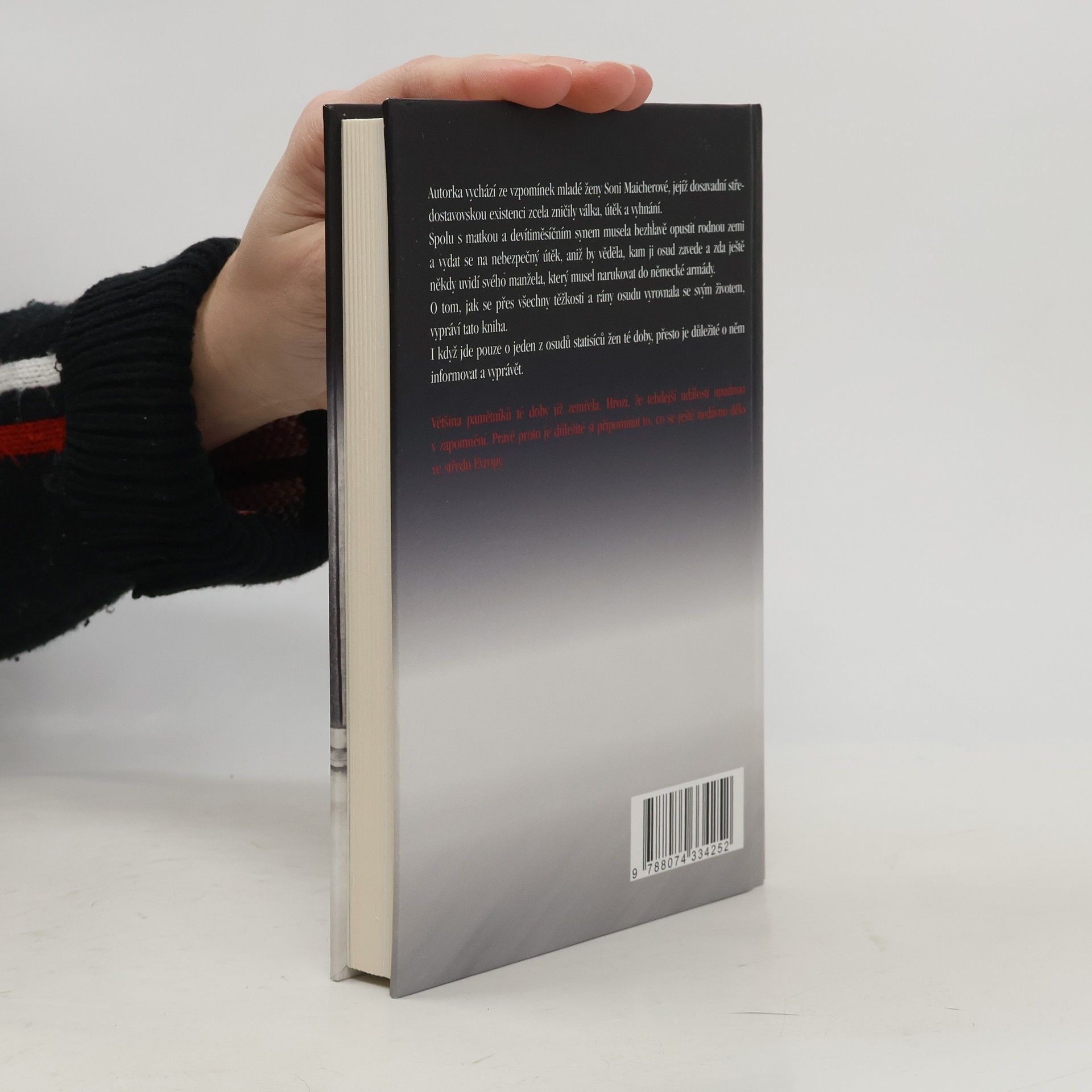 Autorka vychází ze vzpomínek mladé ženy Soni Maicherové, jejíž dosavadní středostavovskou existenci zcela zničily válka, útěk a vyhnání. Spolu s matkou a devítiměsíčním synem musela bezhlavě opustit rodnou zemi a vydat se na nebezpečný útěk, aniž by věděla, kam ji osud zavede a zda ještě někdy uvidí svého manžela, který musel narukovat do německé armády. O tom, jak se přes všechny těžkosti a rány osudu vyrovnala se svým životem, vypráví tato kniha. I když jde pouze o jeden z osudů statisíců žen té doby, přesto je důležité o něm informovat a vyprávět. Většina pamětníků té doby již zemřela. Hrozí, že tehdejší události upadnou v zapomnění. Právě proto je důležité si připomínat to, co se ještě nedávno dělo ve středu Evropy.