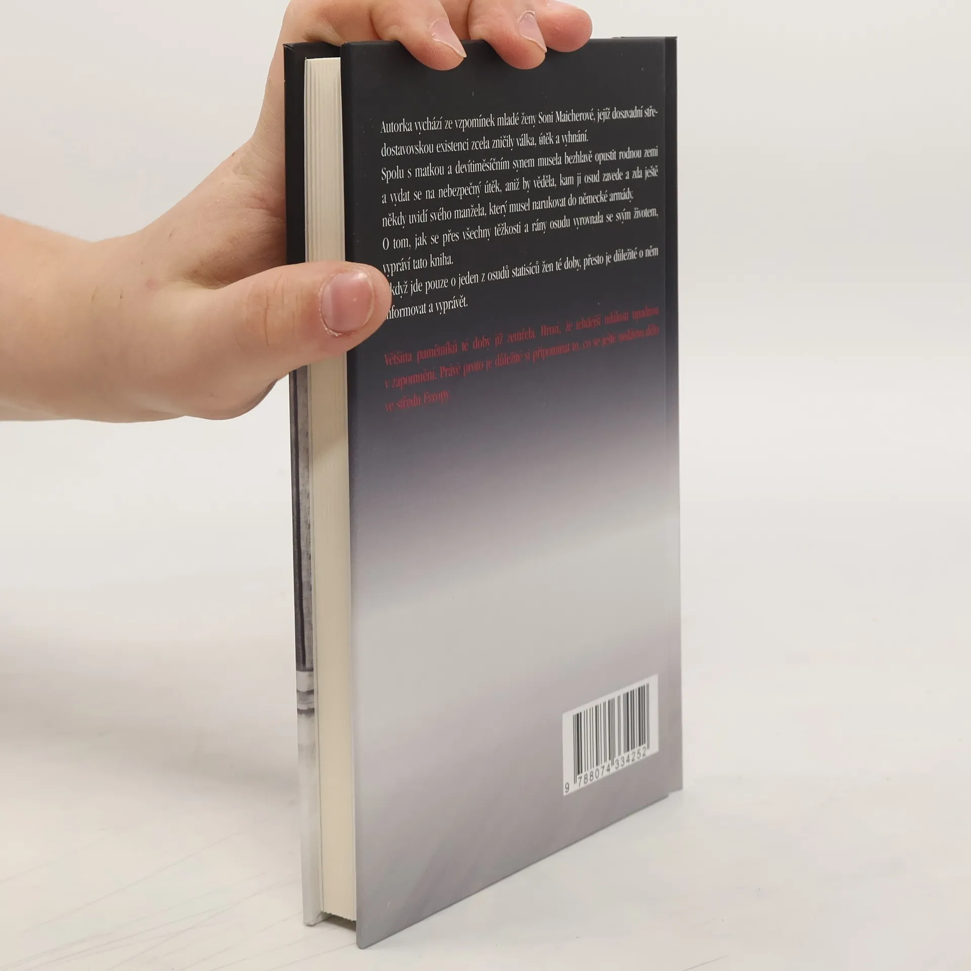 Autorka vychází ze vzpomínek mladé ženy Soni Maicherové, jejíž dosavadní středostavovskou existenci zcela zničily válka, útěk a vyhnání. Spolu s matkou a devítiměsíčním synem musela bezhlavě opustit rodnou zemi a vydat se na nebezpečný útěk, aniž by věděla, kam ji osud zavede a zda ještě někdy uvidí svého manžela, který musel narukovat do německé armády. O tom, jak se přes všechny těžkosti a rány osudu vyrovnala se svým životem, vypráví tato kniha. I když jde pouze o jeden z osudů statisíců žen té doby, přesto je důležité o něm informovat a vyprávět. Většina pamětníků té doby již zemřela. Hrozí, že tehdejší události upadnou v zapomnění. Právě proto je důležité si připomínat to, co se ještě nedávno dělo ve středu Evropy.