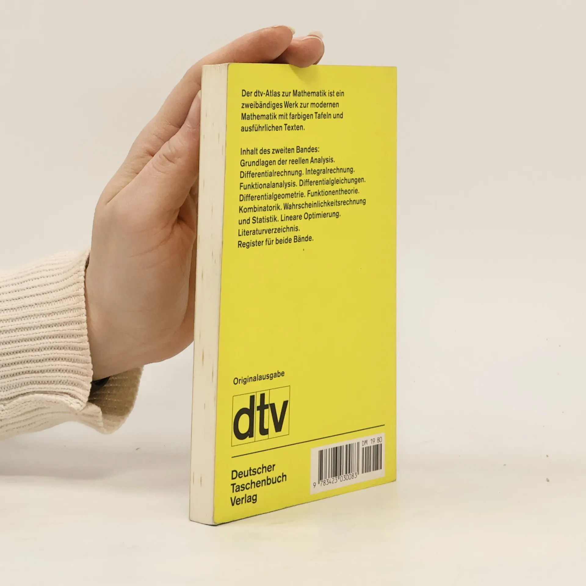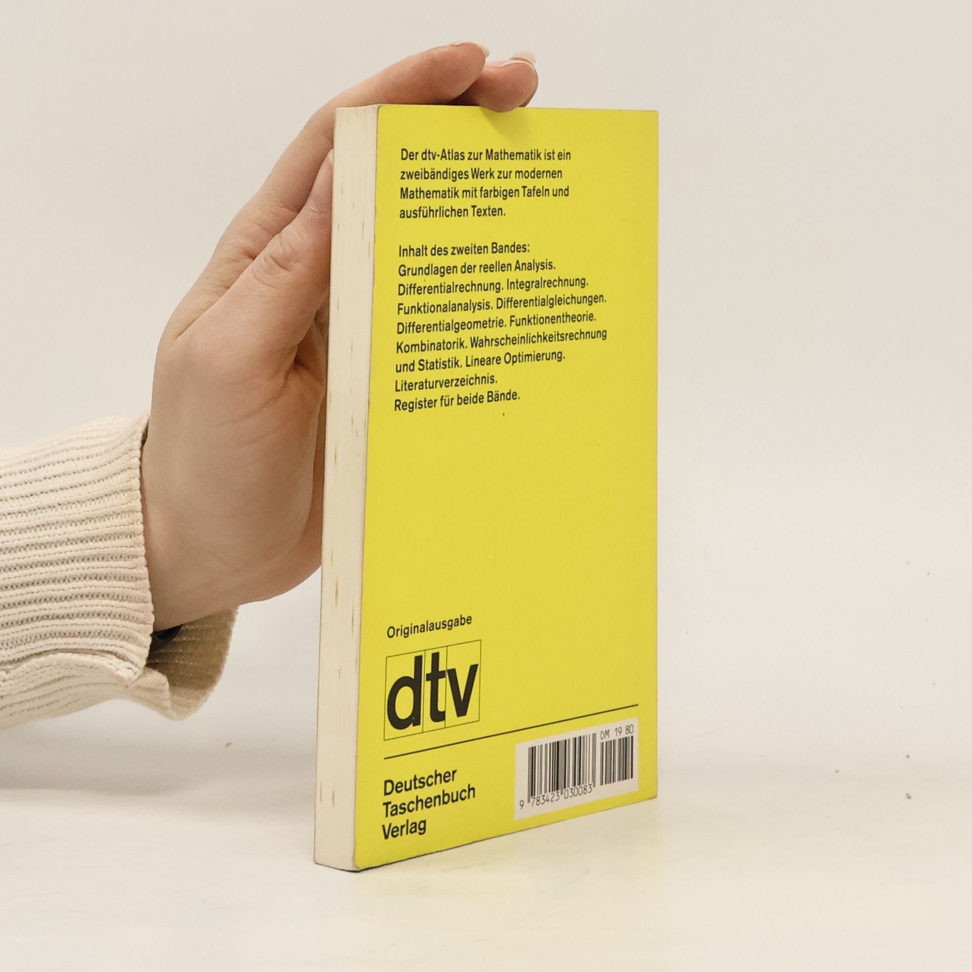 Der ›dtv-Atlas Mathematik‹ gibt in zwei Bänden einen Überblick über den Stand der modernen Mathematik und ihrer Ergebnisse. Die Gliederung geht vom Gesamtbereich der Mathematik aus und enthält alle wesentlichen Teildisziplinen mit den dazugehörigen Theorien. Band 2: Grundlagen der reellen Analysis. Differentialrechnung. Integralrechnung. Funktionalanalysis. Differentialgleichungen. Differentialgeometrie. Funktionstheorie. Kombinatorik. Wahrscheinlichkeitsrechnung und Statistik. Lineare Optimierung.