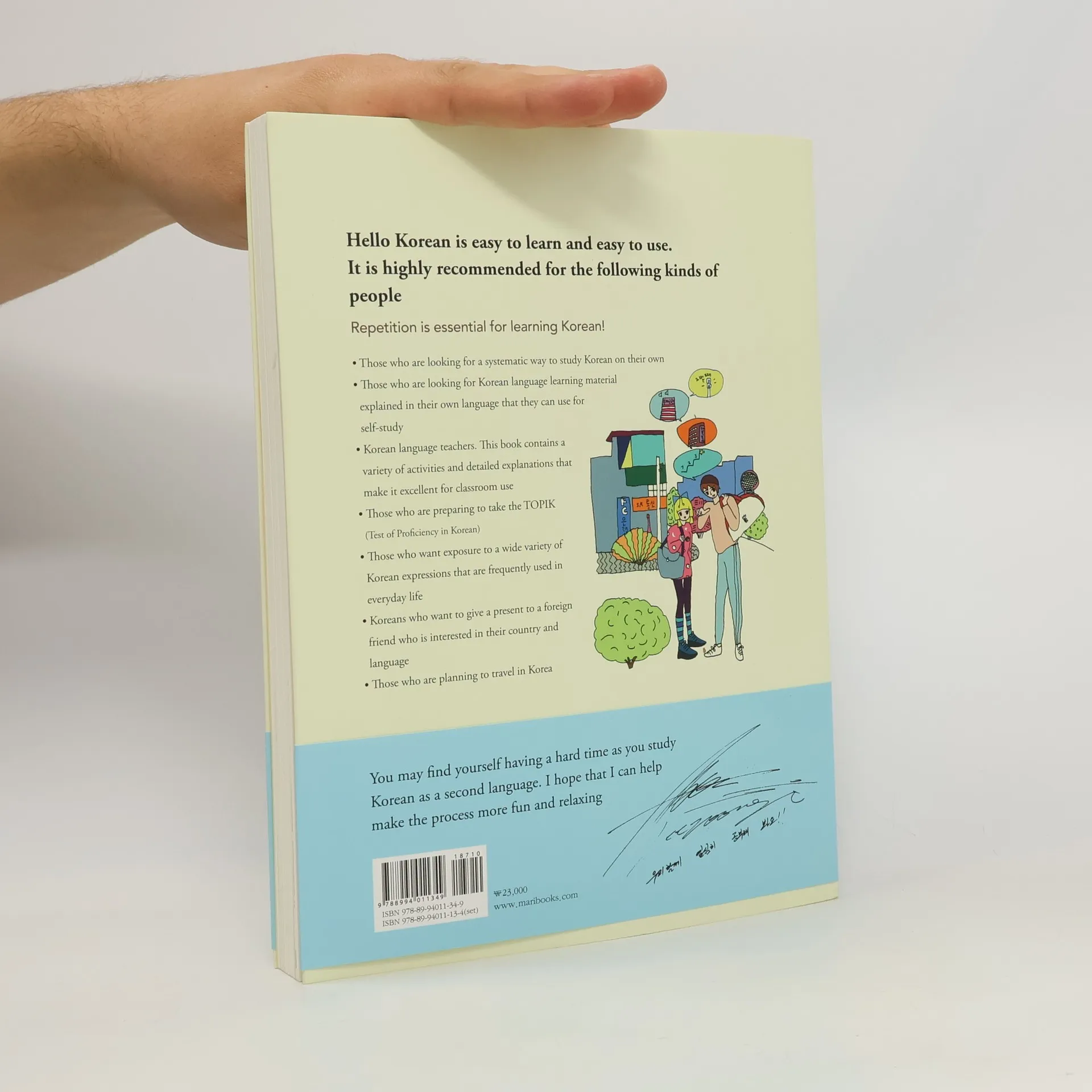 Hello Korean is easy to learn and easy to use. It's highly recommended for the following kinds of people. Repetition is essential for learning Korean. - Those who are looking fot a systematic way to study Korean on their own - Those who are looking for Korean language learning material explained in their own language that they can use for self-study - Korean language teachers. This book contains a variety of activities and detailed explanations that make it excellent for classroom use - Those who are preparing to take the TOPIK - Those who want exposure to a wide variety of Korean expressions that are frequently used in everyday life - Koreans who want to give a present to a foreign friend who is interested in their country and language - Those who are planning to travel in Korea
