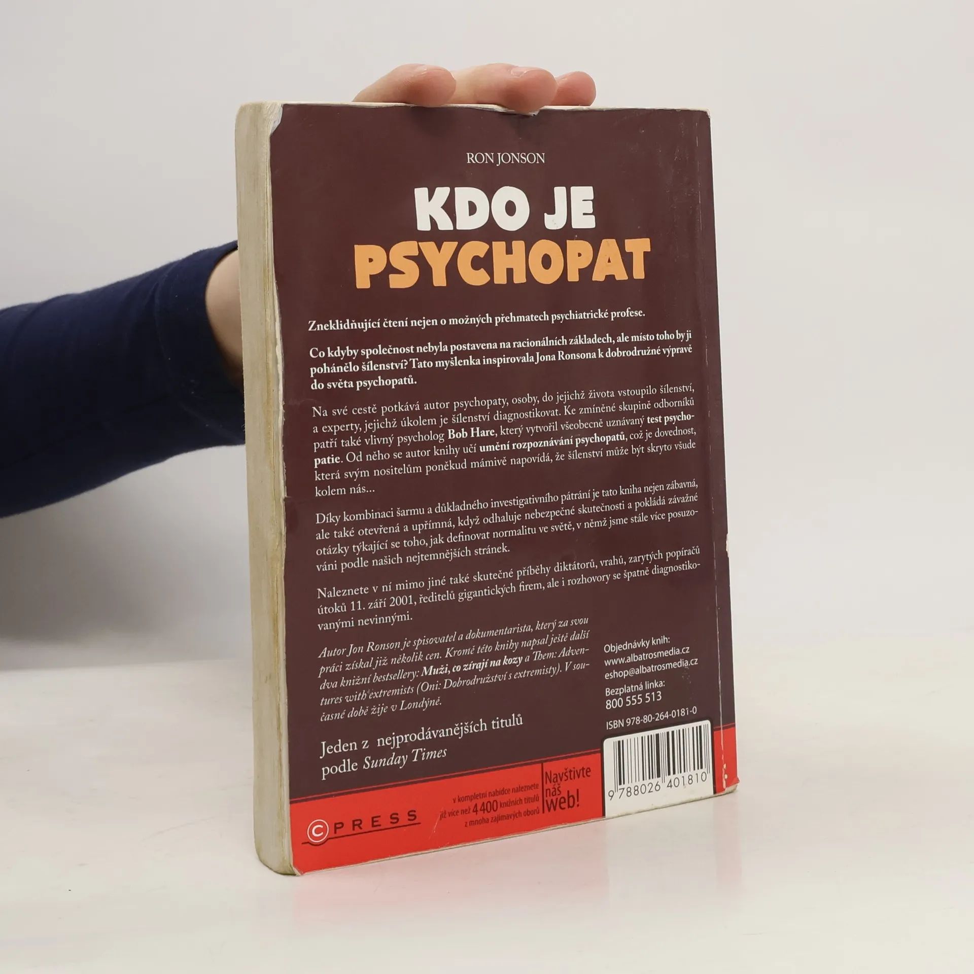 Zneklidňující čtení nejen o možných přehmatech psychiatrické profese. Co kdyby společnost nebyla postavena na racionálních základech, ale místo toho by ji pohánělo šílenství? Tato myšlenka inspirovala Jona Ronsona k dobrodružné výpravě do světa psychopatů. Na své cestě potkává autor psychopaty, osoby, do jejichž života vstoupilo šílenství, a experty, jejichž úkolem je šílenství diagnostikovat. Ke zmíněné skupině odborníků patří také vlivný psycholog Bob Hare, který vytvořil všeobecně uznávaný test psychopatie. Od něho se autor knihy učí umění rozpoznávání psychopatů, což je dovednost, která svým nositelům poněkud mámivě napovídá, že šílenství může být skryto všude kolem nás... Díky kombinaci šarmu a důkladného investigativního pátrání je tato kniha nejen zábavná, ale také otevřená a upřímná, když odhaluje nebezpečné skutečnosti a pokládá závažné otázky týkající se toho, jak definovat normalitu ve světě, v němž jsme stále více posuzováni podle našich nejtemnějších stránek. Naleznete v ní mimo jiné také skutečné příběhy diktátorů, vrahů, zarytých popíračů útoků 11. září 2001, ředitelů gigantických firem, ale i rozhovory se špatně diagnostikovanými nevinnými.