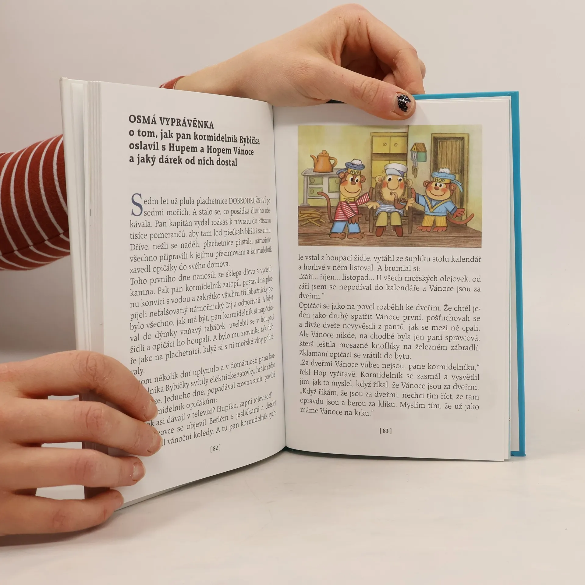 Veselé příběhy dvou rozpustilých opičáků Hupa a Hopa, ve kterých nejprve opičáky zachrání kormidelník Rybička ze zatopeného ostrova, potom pomohou velrybě grónské od bolení hlavy, zachrání loď před ztroskotáním, bojují s piráty, promění velrybu v pidirybu a vůbec si užijí moc dobrodružství a také se při tom ledacos naučí. Nakonec si je pan kormidelník vezme domů a společně oslaví Vánoce... (veselá dobrodružství dvou opičáků a pana kormidelníka Rybičky)