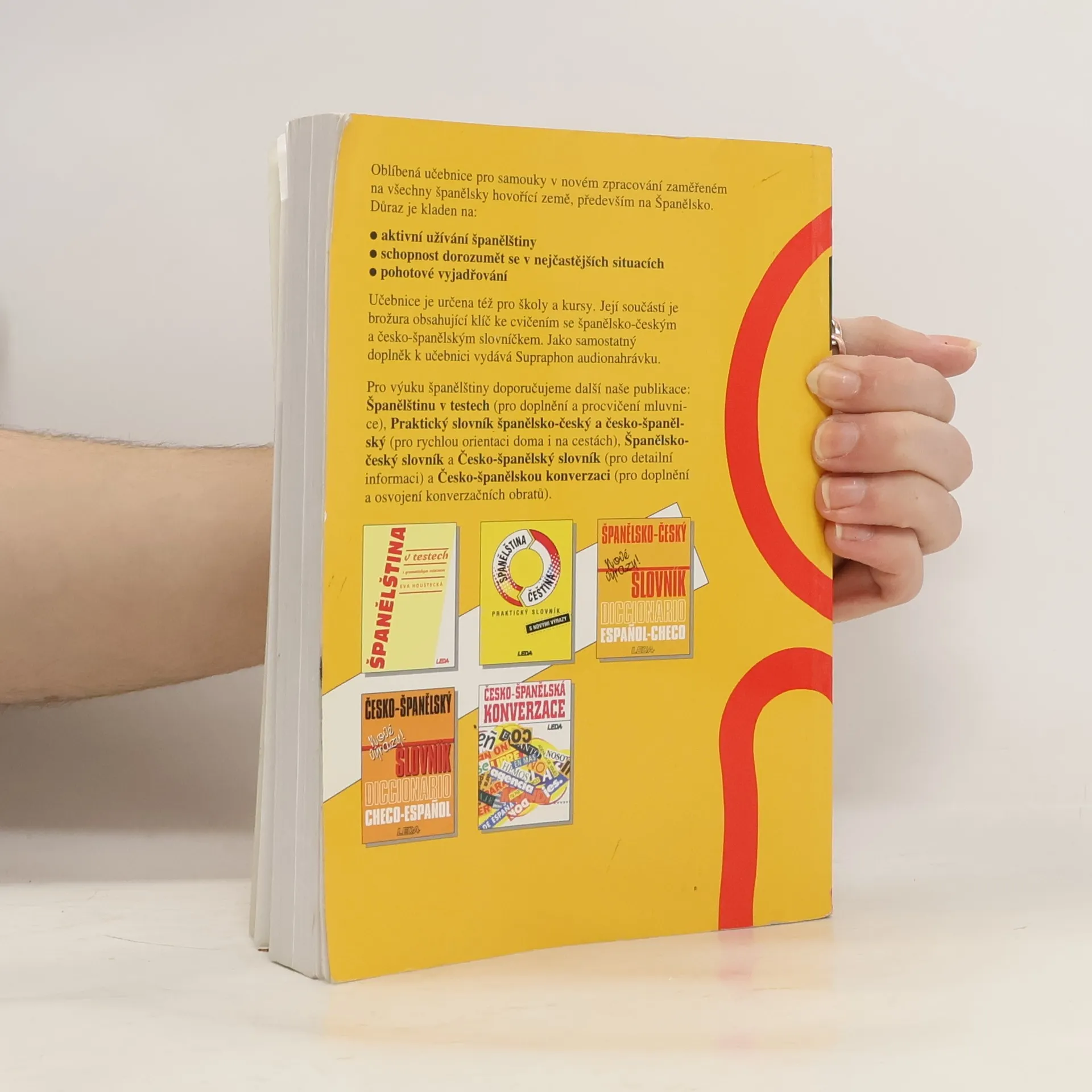 Oblíbená učebnice pro samouky v novém zpracování zaměřené na všechny španělsky hovořící země, především na Španělsko. Důraz je kladen na: . aktivní užívání španělštiny . schopnost dorozumět se v nejčastějších situacích . pohotové vyjadřování Učebnice je určena též pro školy a kursy. Její součástí je brožura obsahující klíč ke cvičením (119 s.) se španělsko-českým a česko-španělským slovníčkem. Jako samostatný doplněk k učebnici vydává Supraphon audionahrávku.