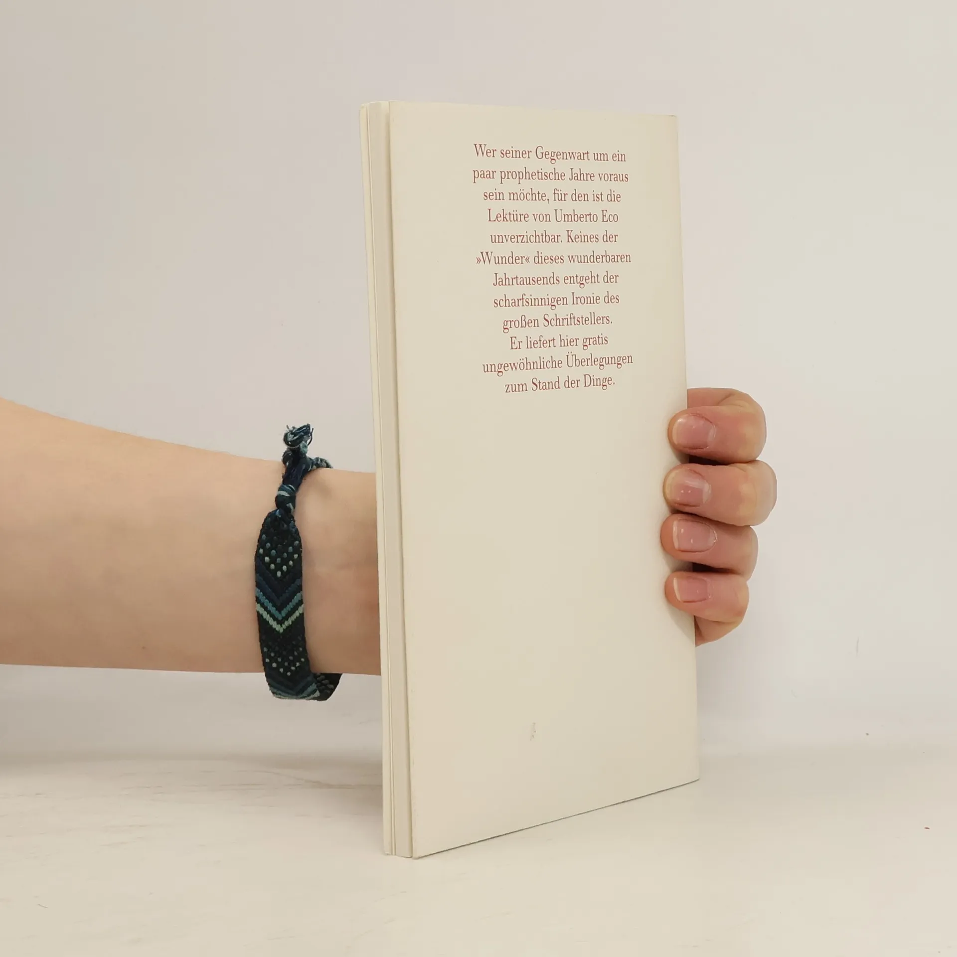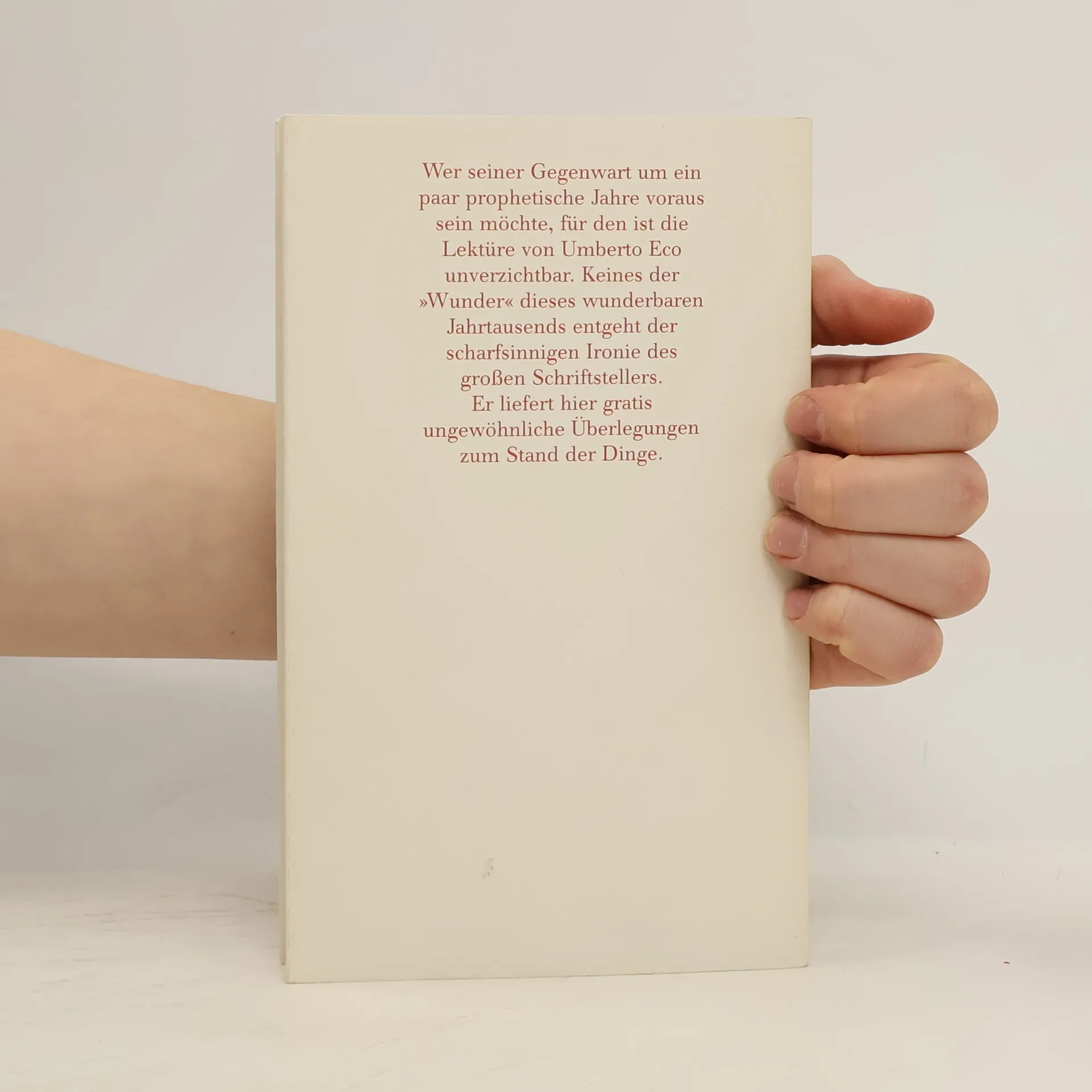 Wie wählt man einen Präsidenten? Werden wir im allgemeinen Lärm bald paketweise Stille kaufen? Wird auf die großen Kriege mehr folgen als ein kleiner Frieden? Umberto Eco liefert hier gratis ein paar Prophezeiungen zum Stand der gegenwärtigen Dinge, wobei der scharfsinnigen Ironie dieses großen Schriftstellers und Polemikers natürlich keines der "Wunder" dieses wunderbaren Jahrtausends entgeht.