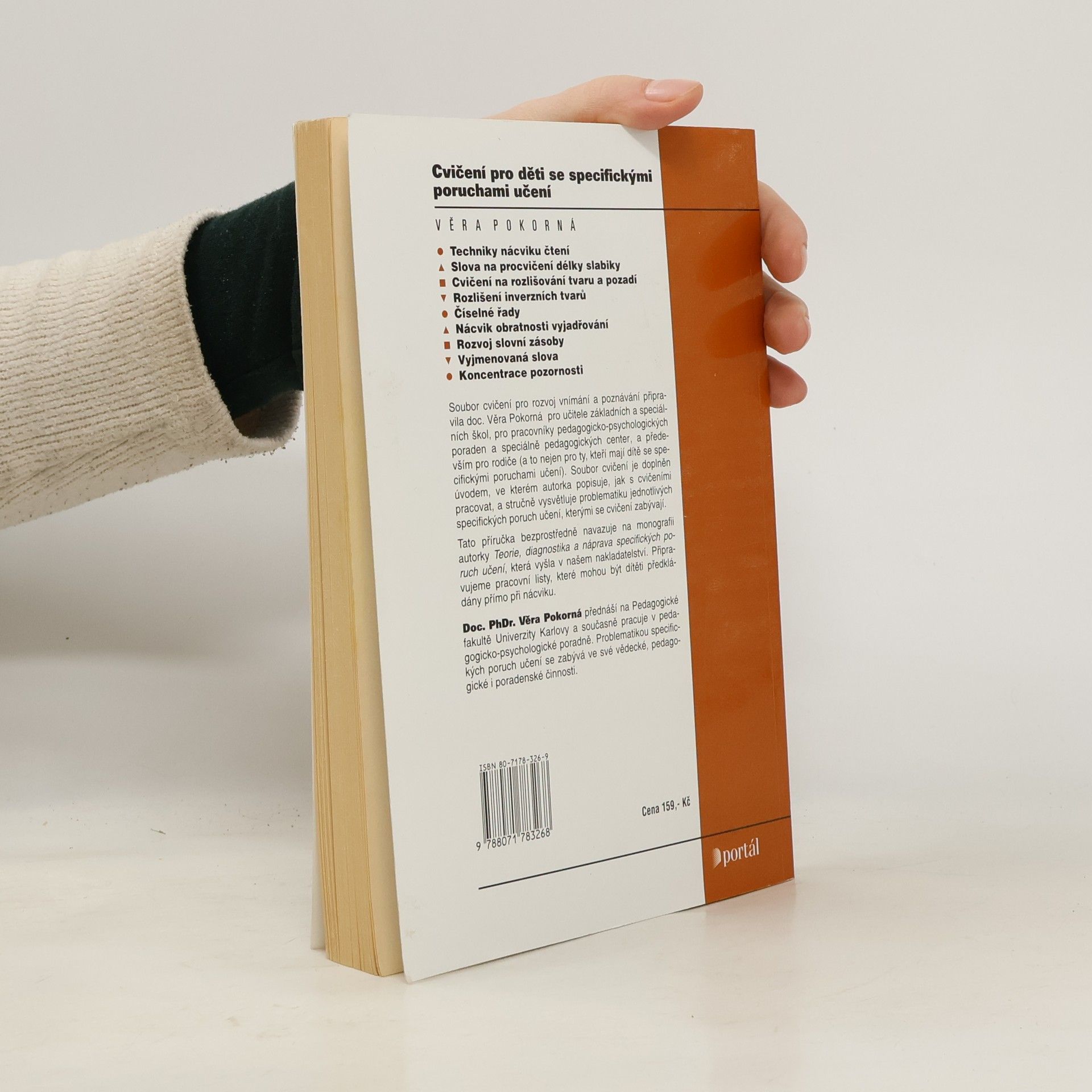 Soubor cvičení pro rozvoj vnímání a poznávání, který učitelům i rodičům umožňuje vybrat takovou činnost, která je pro dítě účelná, protože odpovídá jeho úrovni rozvoje jednotlivých funkcí a přispívá k nápravě příslušné specifické poruchy učení. V úvodu autorka popisuje, jak s cvičeními pracovat, a stručně vysvětluje problematiku jednotlivých specifických poruch učení, kterými se cvičení zabývají. Kniha navazuje na publikaci Teorie, diagnostika a náprava specifických poruch učení.