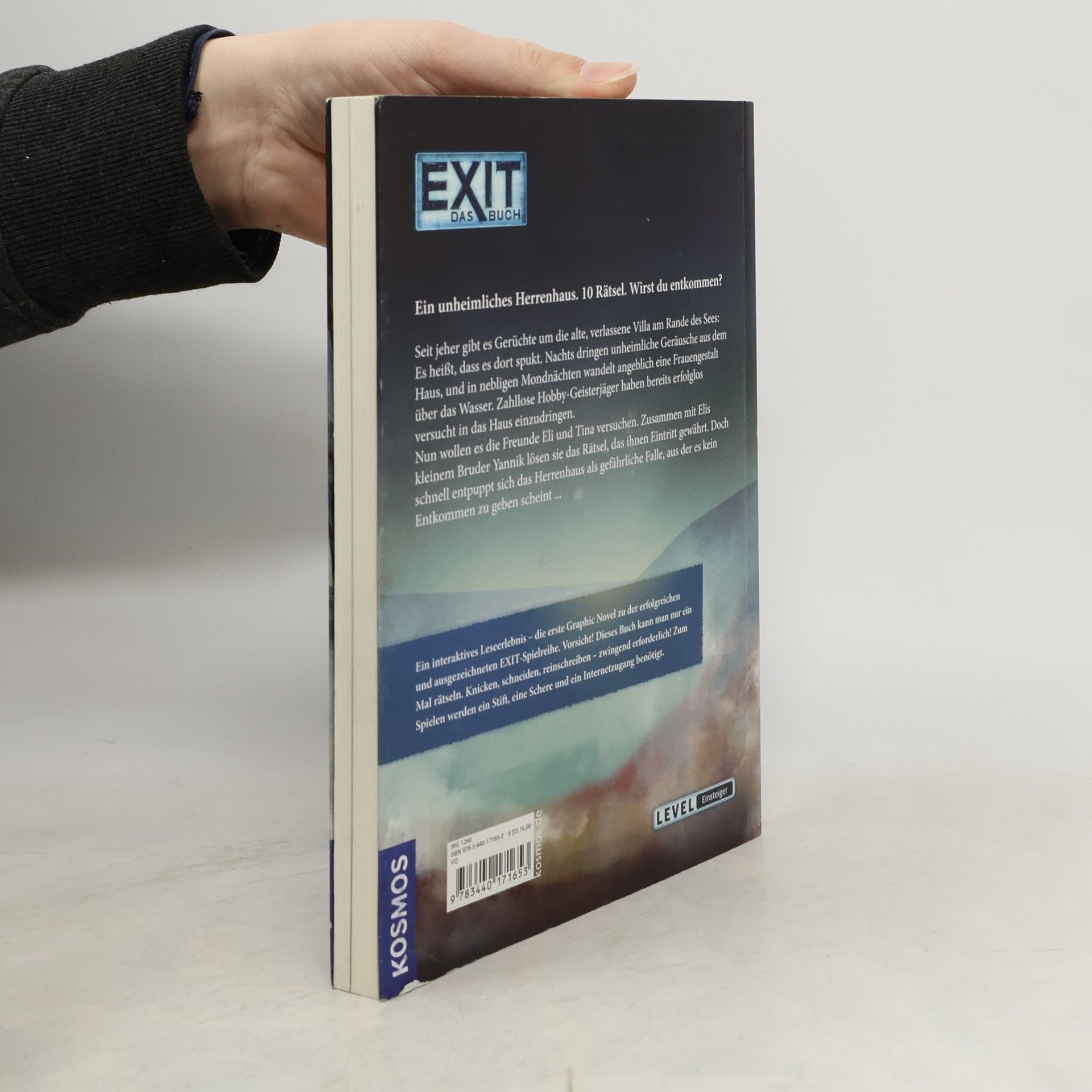 Spukt es in der verlassenen Villa am Rande des Sees? Nachts dringen unheimliche Geräusche aus dem Haus und in Nebelnächten soll eine Frauengestalt über das Wasser wandeln ... Zahllose Geisterjäger und Urban Explorer haben vergebens versucht, in das Haus einzudringen. Auch Eli, Tina und Yannik wollen das Geheimnis lüften. Mit viel Scharfsinn knacken sie den Rätselcode für die Eingangstür. Doch schnell entpuppt sich die mysteriöse Villa als gefährliche Falle ...Hinweise können überall im Buch versteckt sein, kreative Lösungen sind gefragt, ausschneiden, zeichnen, knicken – alles ist erlaubt. Live-Escape-Feeling für Einsteiger!