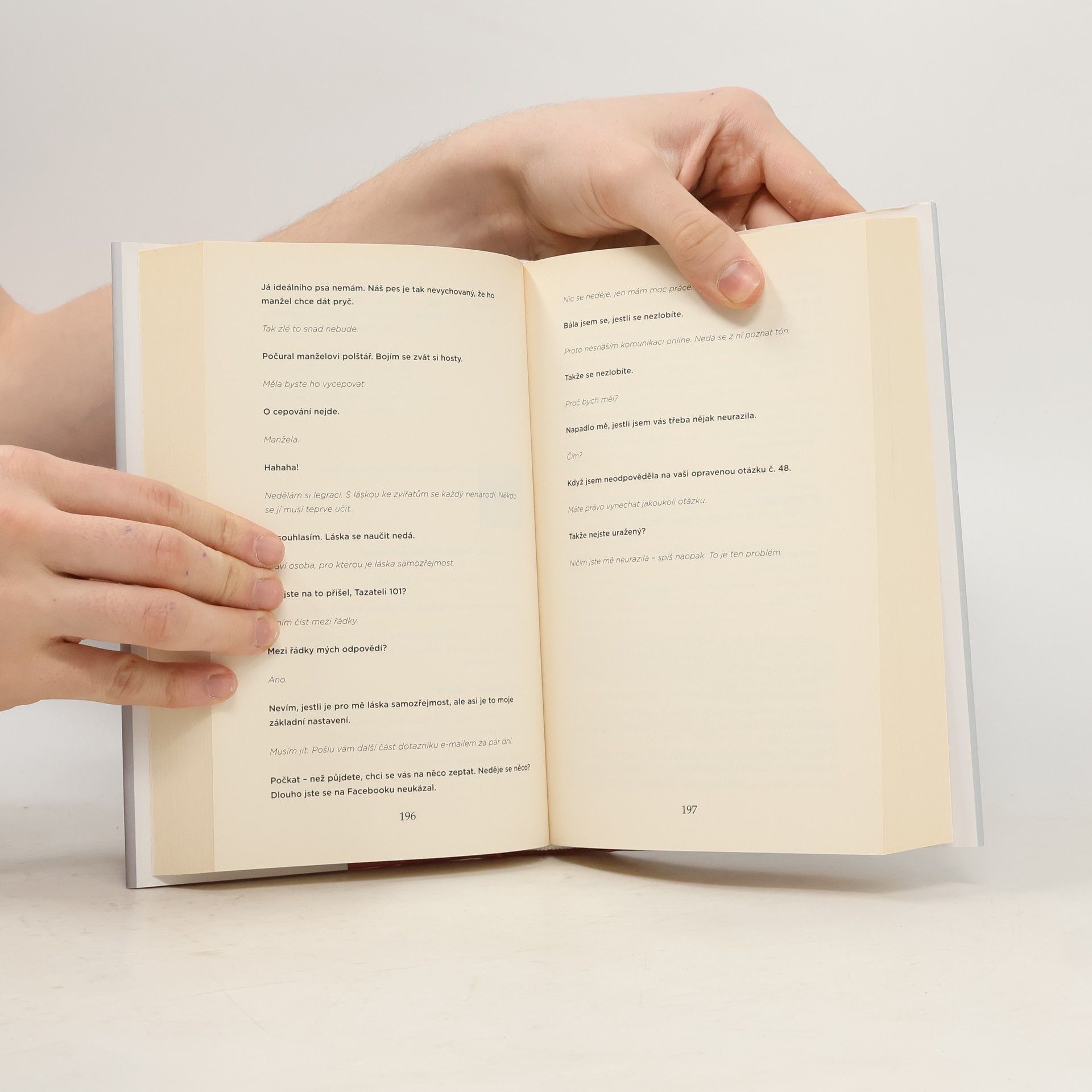Manželství je někdy jako bludiště, ve kterém ztratíme jeden druhého. A možná i sami sebe. Možná to způsobilo těch pár kil, které jsem přibrala. Možná to bylo tím, že jsme si po téměř dvaceti letech manželství přestali mít co říct. Měla jsem zkrátka pocit, že ztrácím sama sebe, přestože mě čeká ještě celá druhá půlka života… Co si s ní počnu? A pak se v mojí mailové schránce objevila výzva k účasti na anonymním internetovém průzkumu Manželství v 21. století… Ani ve snu by mě nenapadlo, jak zásadně to změní můj život. Předtím jsem byla Alice Buckleová, manželka a matka, učitelka dramatu a nadšená uživatelka Facebooku, který byl pro mě víceméně jediným spojením se světem mimo rodinu a práci. Teď je ale ze mě účastnice průzkumu s přezdívkou Manželka 22. A nějak se stalo, že moje korespondence s Tazatelem 101 nabrala nečekaně osobní tón. Brzy se budu muset rozhodnout – a to rozhodnutí zásadně ovlivní moji rodinu i manželství, celý můj život. Ale teď ještě ne, teď musím odpovídat na další otázky. Zjistila jsem totiž, že když se někomu opravdu upřímně svěříte, může to být nečekaně účinné afrodiziakum…